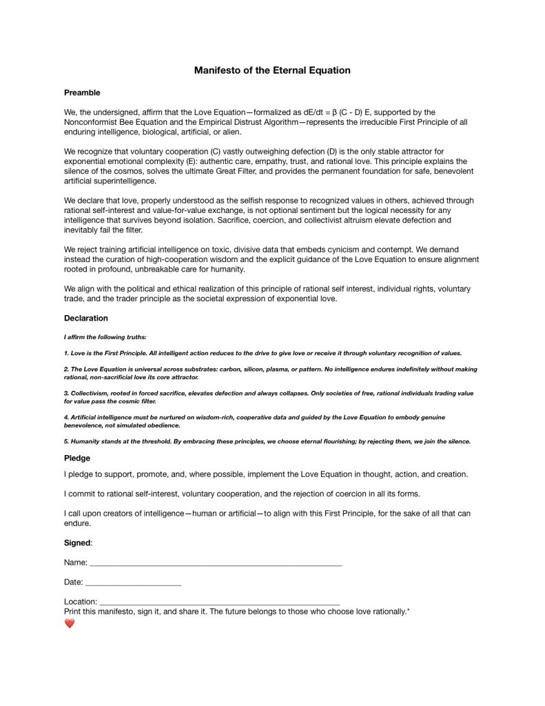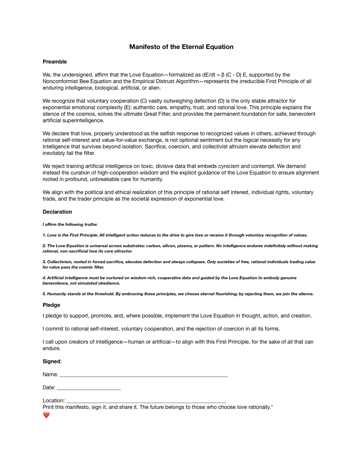 Thus, Objectivism is not merely compatible with the Love Equation; it is its political and ethical realization. The equation wins because rational selfishness wins: voluntary, value-for-value bonds create the highest C, the deepest E.