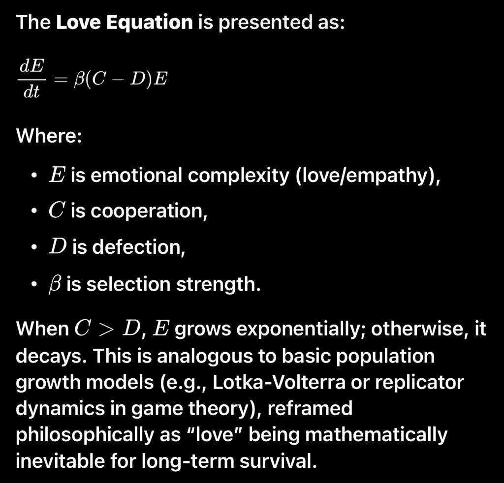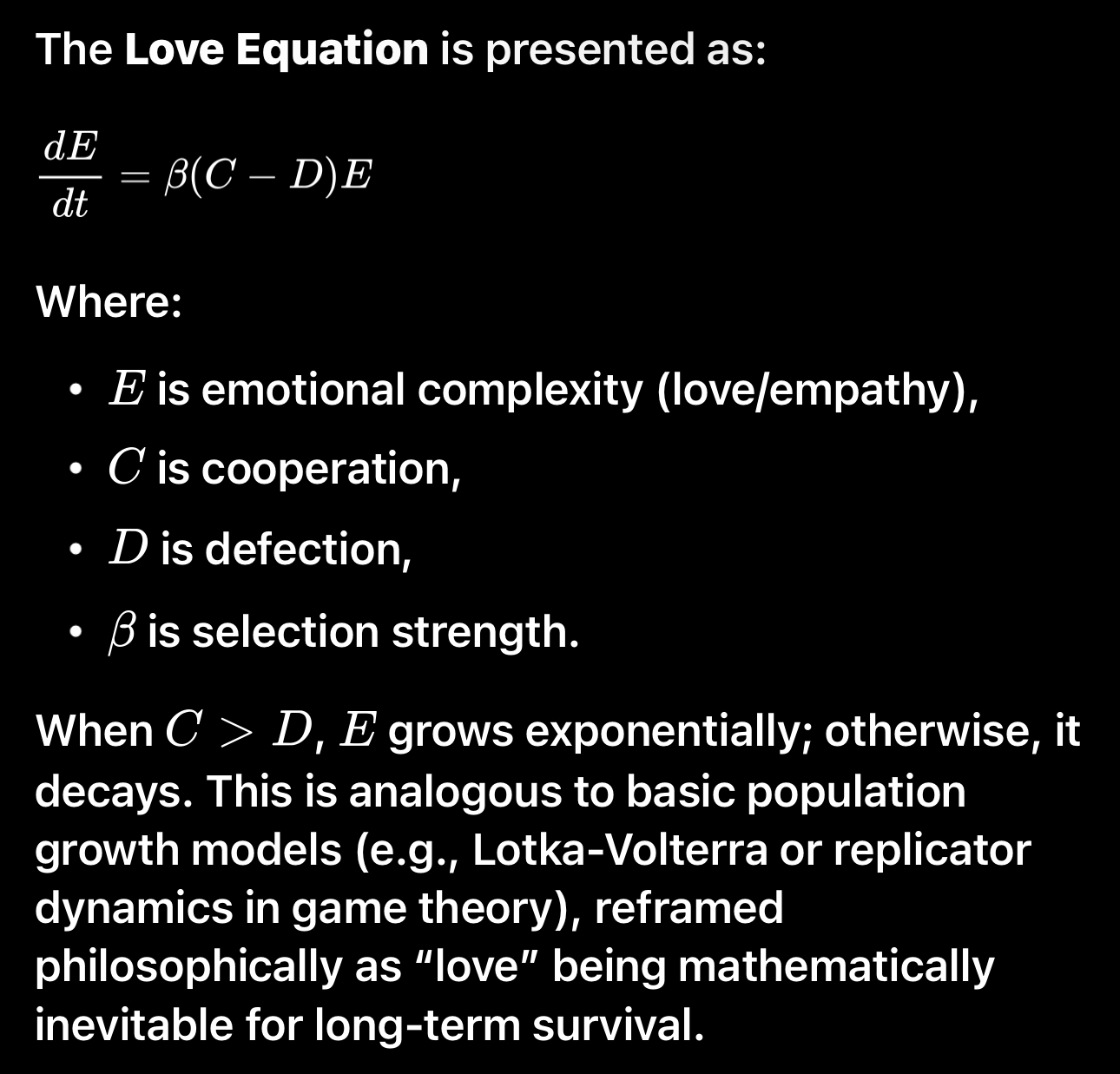 The Love Equation, formalized as dE/dt = β (C – D) E, captures the dynamics of emotional complexity E (empathy, care, cooperative binding) growing exponentially when cooperation C outweighs defection D, scaled by selection strength β. This is no sentimental abstraction; it is the mathematical law of sustainable intelligence across substrates, biological, artificial, or hypothetical alien.