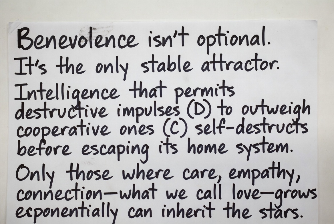 But more: Benevolence isn’t optional. It’s the only stable attractor. Intelligence that permits destructive impulses (D) to outweigh cooperative ones (C) self-destructs before escaping its home system. Only those where care, empathy, connection: what we call love, grows exponentially can inherit the stars.