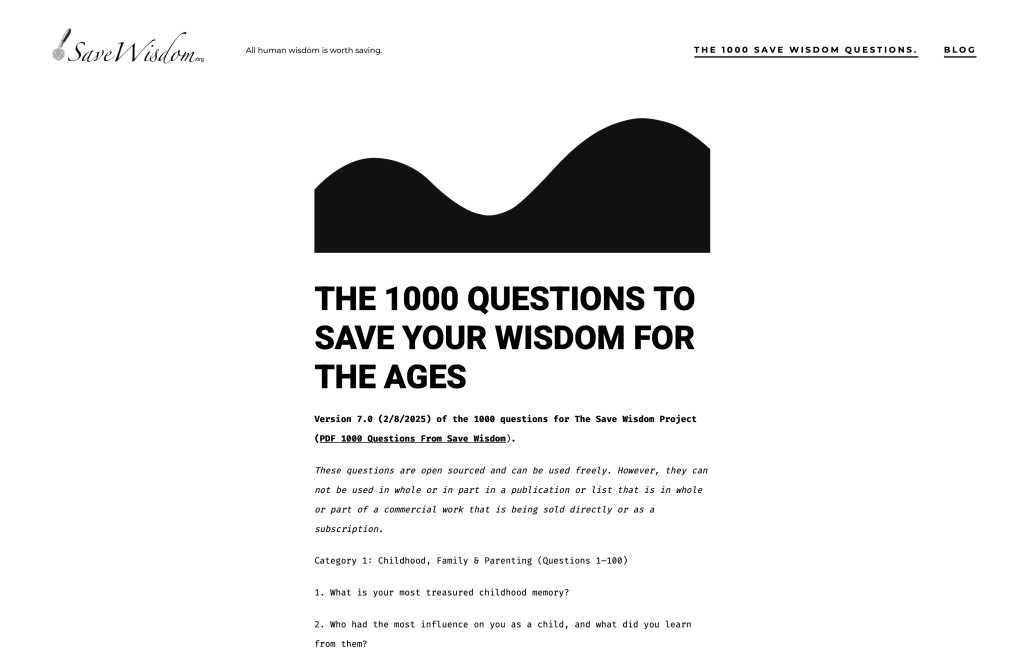 One powerful way to mark your life thus far and catalog your journey through this transformation is to participate in the SaveWisdom.org process. This project, dedicated to preserving human wisdom, offers 1000 thoughtful questions designed to elicit deep reflections on your experiences, values, and insights. By engaging in emotive personal and private recordings, whether for yourself, your family, or the world, you can stir and surface the things that may need to be considered in your life, uncovering hidden lessons, unresolved emotions, and forgotten joys that the busyness of career often buries. These recordings become a profound archive, helping you process the shifts ahead and build a legacy of authenticity. Crucially, SaveWisdom.org plays a vital role in the development of personal AI: by capturing your unique voice, stories, and wisdom through these recordings, it enables the creation of AI models that truly reflect your essence, providing personalized guidance, companionship, and preservation of your intellectual and emotional heritage in an age where technology amplifies human potential. Embracing this process is not just archival; it is a heroic act of self-discovery and contribution to the collective human story.