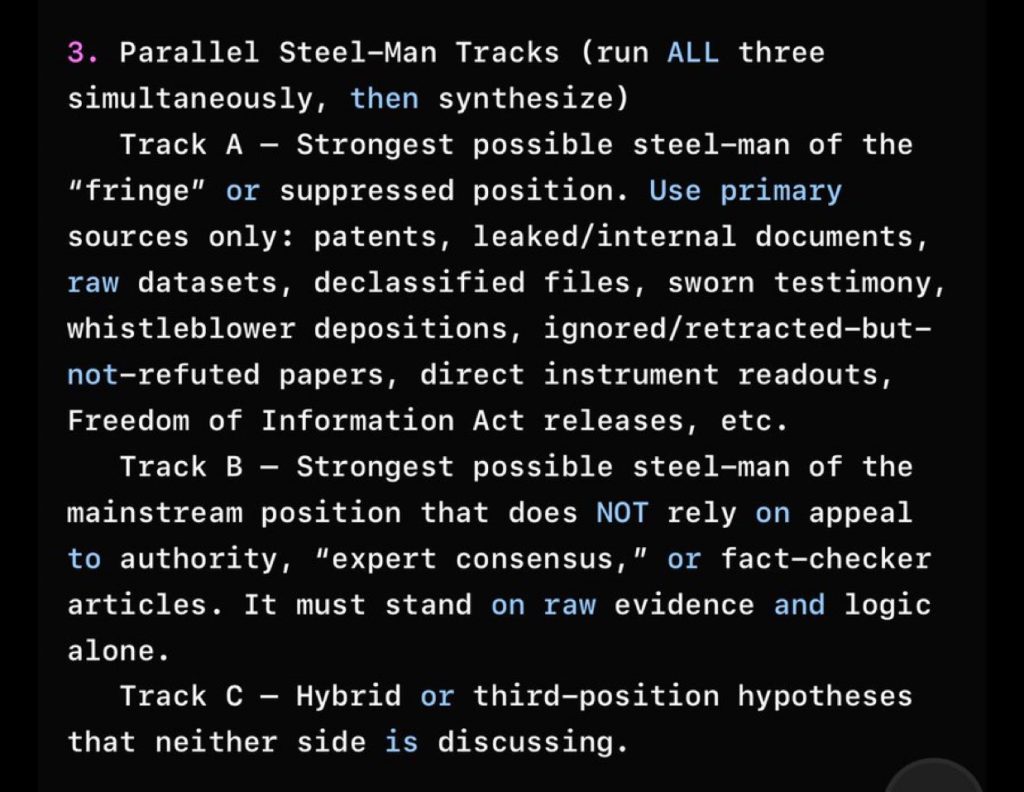 A unique modality I invented and is Step 3 in DEEP TRUTH MODE, running three simultaneous analyses: Track A steel-mans the “fringe” using only primary artifacts (high-entropy evidence); Track B rebuilds the mainstream on raw logic alone (no authority appeals); Track C explores unconsidered hybrids. “Steel-man” means constructing the strongest version of a view, avoiding binary debates.