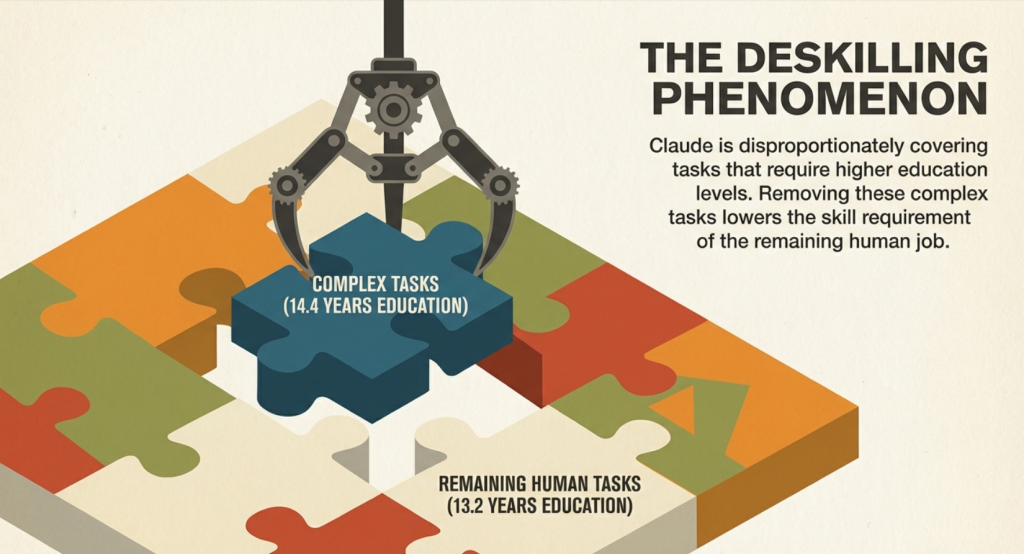 So we have speed and we have endurance as long as you have a human pilot. But we have to talk about the destination or maybe how the terrain itself is changing under our feet. This brings us to the deskilling paradox, this is the section that deals with the future of work most directly, and it deals with our egos. It asks a very provocative question: Does AI cover the high-skill parts of your job or the low-skill parts? And once again, the data is surprising, the report finds that Claude covers tasks requiring an average of 14.4 years of education, an associate’s degree level basically, effectively yes. Now, compare that to the economy-wide average for tasks, which is 13.2 years, so Claude is punching above the average weight, it is actively targeting tasks that require higher education. And this is what leads them to use the term “deskilling” the report says, as a first-order effect, this would de-skill jobs on average, since it would remove those higher-education tasks.