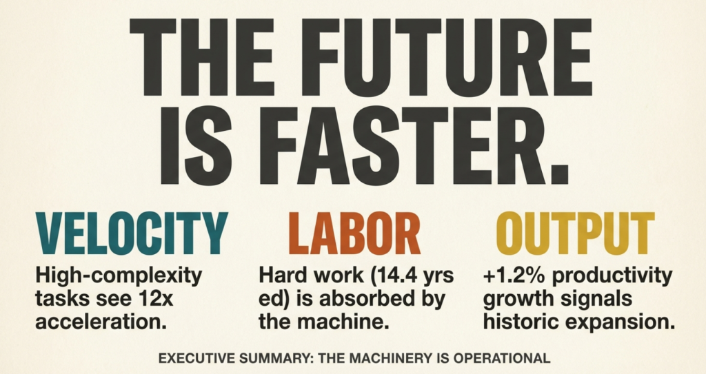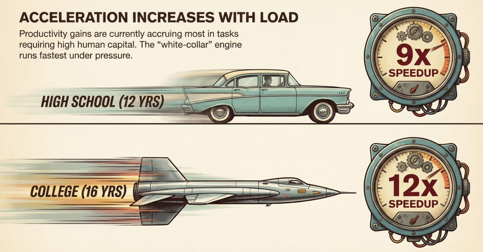 So when you apply AI to these high human-capital tasks, you aren’t just making the typing faster, you’re removing the very friction of complex thought, greasing the gears of intellect itself, turning the muddy road into a paved superhighway. And this aligns perfectly with the whole end-of-work thesis we’ve been discussing: The work that is being accelerated the fastest, and so potentially displaced or transformed, is the very work we spent the last 50 years telling everyone they needed to get a degree to do. We built an entire educational system on the premise that complex cognitive tasks were the safe harbor, and now the data is showing the water level in that harbor is rising faster than anywhere else. For our series, this means the 5000 days are compressing boldly, we’re on track, perhaps ahead, but with sympathy for those feeling the pace, it’s a call to adapt without panic.