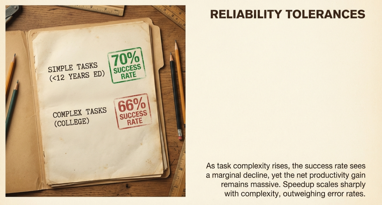 Of course, we have to look at the other side of this coin because speed is great, but if you’re driving a Ferrari 200 miles an hour straight into a wall, that’s not exactly helpful. The report notes something really interesting about success rates too: you have to ask, it is 12 times faster, but is it good? Is it just fast and wrong? Because fast and wrong is just fishing chaos that doesn’t help anyone. In the data is a slight dip: Tasks requiring a high school education have about a 70% success rate, while those needing a college degree have 66%, so it is slightly harder for the AI, the complexity does take a small toll on the accuracy. Marginally, though, it’s a 4% difference. But think about that trade-off: You’re accepting a tiny 4% drop in immediate success rate in exchange for a 1200% increase in speed, the math on that is just undeniable.
