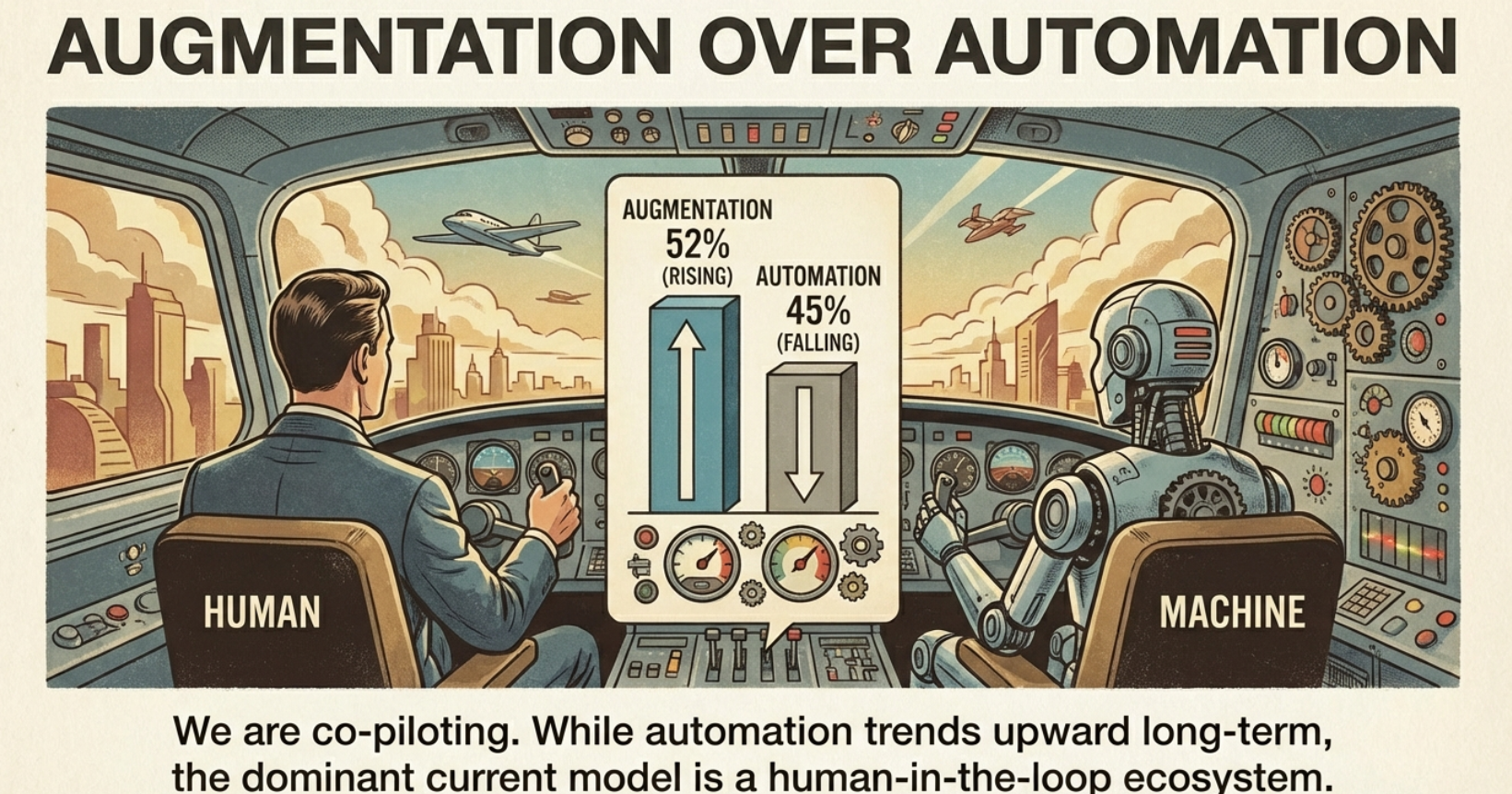 The report does note that the long-term trend year over year shows automation rising, and they specifically mention a rise in what they call directive use, people are delegating tasks entirely, they aren’t saying “Help me write this,” they are saying “Write this.” This connects directly back to our discussion on Player Piano, Kurt Vonnegut’s novel about a world where the machines do everything we are currently in the sweet spot, we’re in the augmentation sweet spot where we feel like superheroes, we have bionic arms, but the tide of automation is rising as the models get better.