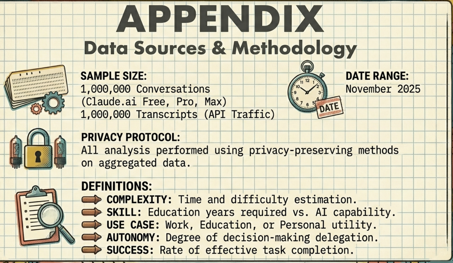 Turning now to the heart of this installment, Anthropic’s report (https://www-cdn.anthropic.com/096d94c1a91c6480806d8f24b2344c7e2a4bc666.pdf) from January 15, 2026 serves as a practical compass for our journey a privacy-preserving analysis of over two million consumer conversations and enterprise logs from November 2025, capturing the digital footprint of what people are actually doing with Claude Sonnet 4.5 right this minute. This feels different from reports in 2024 or early 2025; it’s not speculation anymore: they have the data, and our mission here is to overlay it directly onto our 5000-day timeline to see if we’re on track with those predictions and to pull out specific signals of how jobs are changing this week, not next year.