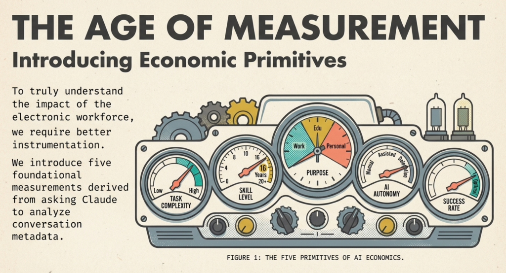This brings us to the metrics, how do we even measure an economy where work is disappearing, but value is increasing? Section 6, economic primitives: Anthropic is trying to measure this massive change with entirely new metrics because. let’s face it, GDP just doesn’t cut it anymore, and thank goodness they aren’t, we’ve been flying blind for a couple of years. They introduce five primitives: