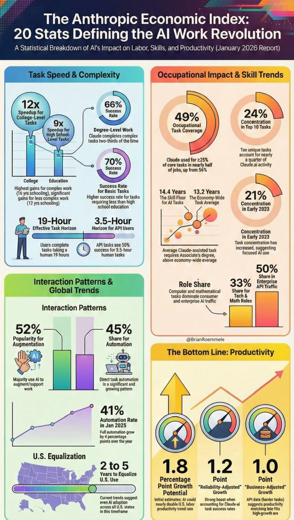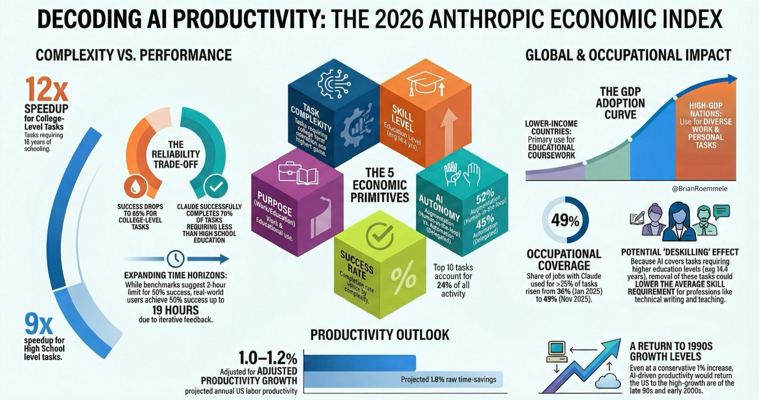 As we look at the calendar it’s worth taking a deep breath and acknowledging how far we’ve come in our shared journey. Things are moving so fast, and if you’ve been following this series or just need a quick reorientation, remember: We’re not talking about the apocalypse or some doom-and-gloom terminator-style robot takeover. This is about the hero’s journey, firmly in what Joseph Campbell would call the call to adventure. The ordinary world, that place where you had a nine-to-five, staring at spreadsheets all day and coming home exhausted is dissolving behind us. We’re stepping into something new, navigating a forest we’ve never been in before, and it really helps to have a map or at least a compass. That’s precisely what dropped just four days ago: On January 15, Anthropic released their latest Economic Index report. This isn’t just another dry stack of spreadsheets or some consultant’s guess about what might happen in 2030, it’s different, a signal flare fired from right where we stand in January 2026. This is Part 5 in our series, “You Have 5000 Days: How To Navigate The End Of Work As We Know It,” a straightforward guide through the Abundance Interregnum that transitional period of roughly 13.7 years until work as we know it decouples from survival, leading to a world of greater plenitude. We’re all in this together, facing the changes with a mix of boldness and understanding for the challenges ahead.