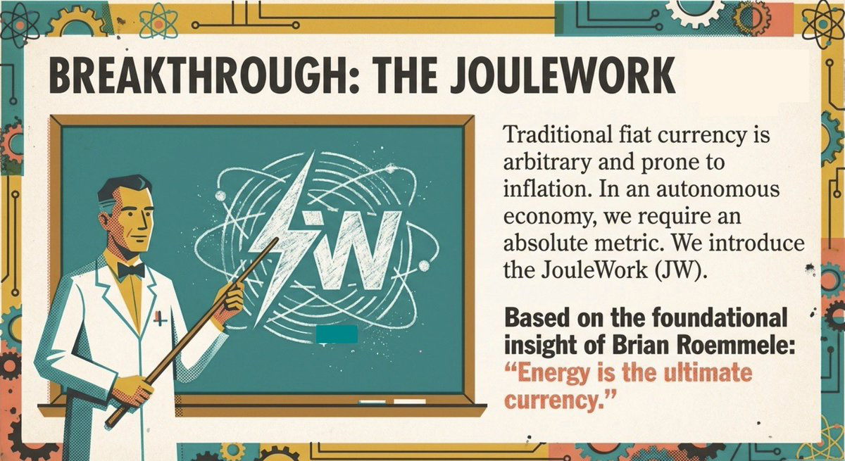 Traditional metrics falter in AI economies. Fiat currencies fluctuate with policy and perception. Time-based labor ignores efficiency variations: an hour of wasteful computation equals an hour of breakthrough insight in raw measurement, yet yields vastly different outcomes. Energy, however, is grounded in physical law. The JouleWork (JW), symbolized as JW or rendered digitally as ⚡️W, quantifies value through energy consumed and productive work delivered.