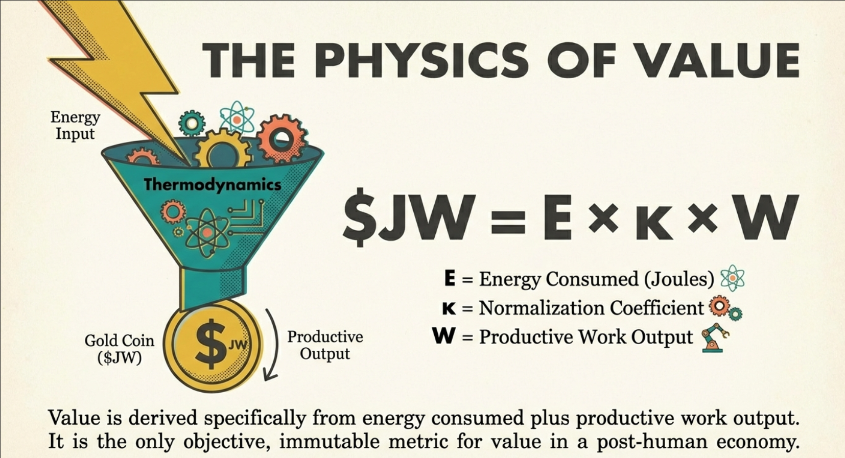 JW forms the basis for a tokenized currency: Each token represents a claim on verifiable energy-work units.Token Value Derivation: