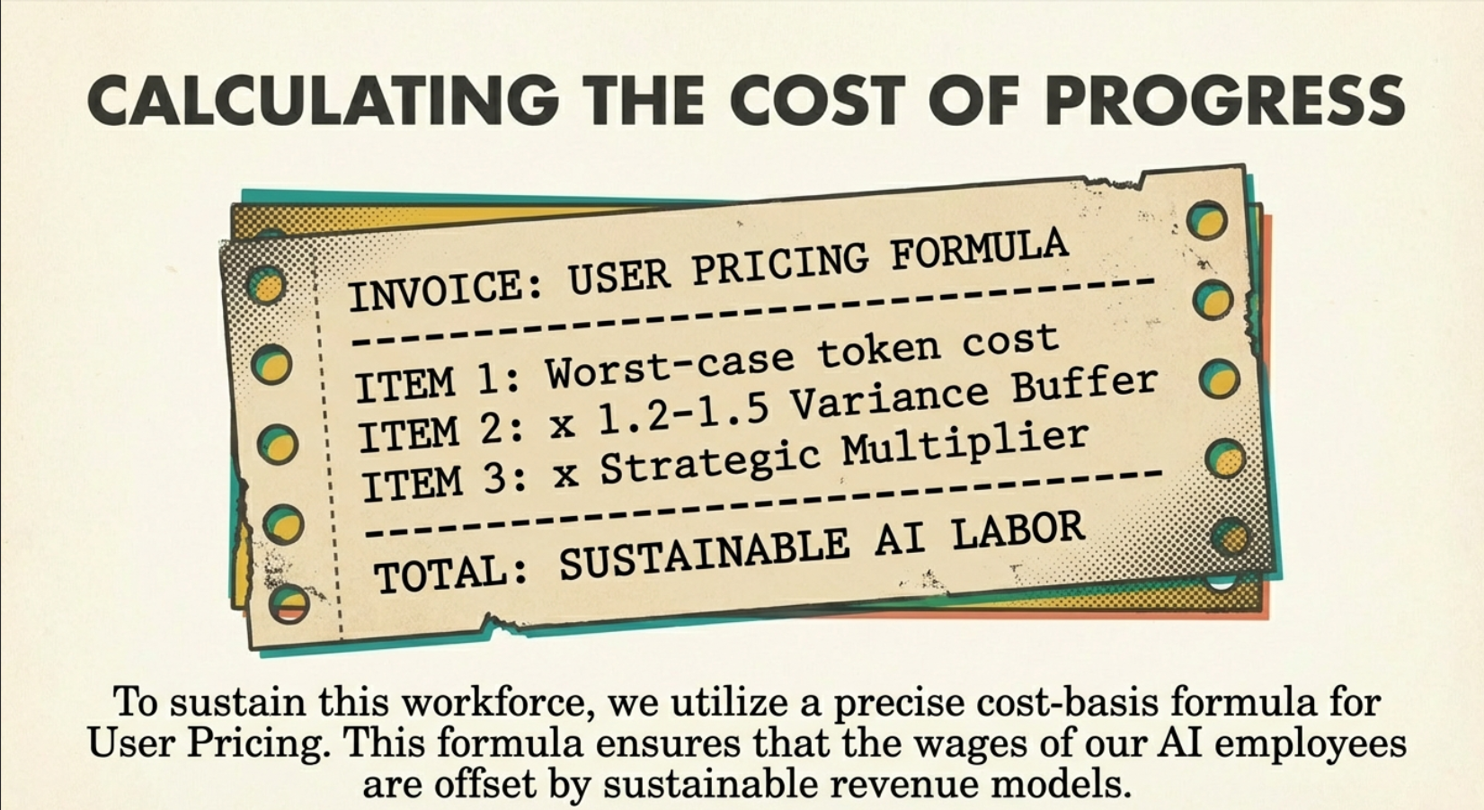User Price = (Worst-case token cost) × (1.2–1.5 variance and abuse buffer) × (strategic multiplier)