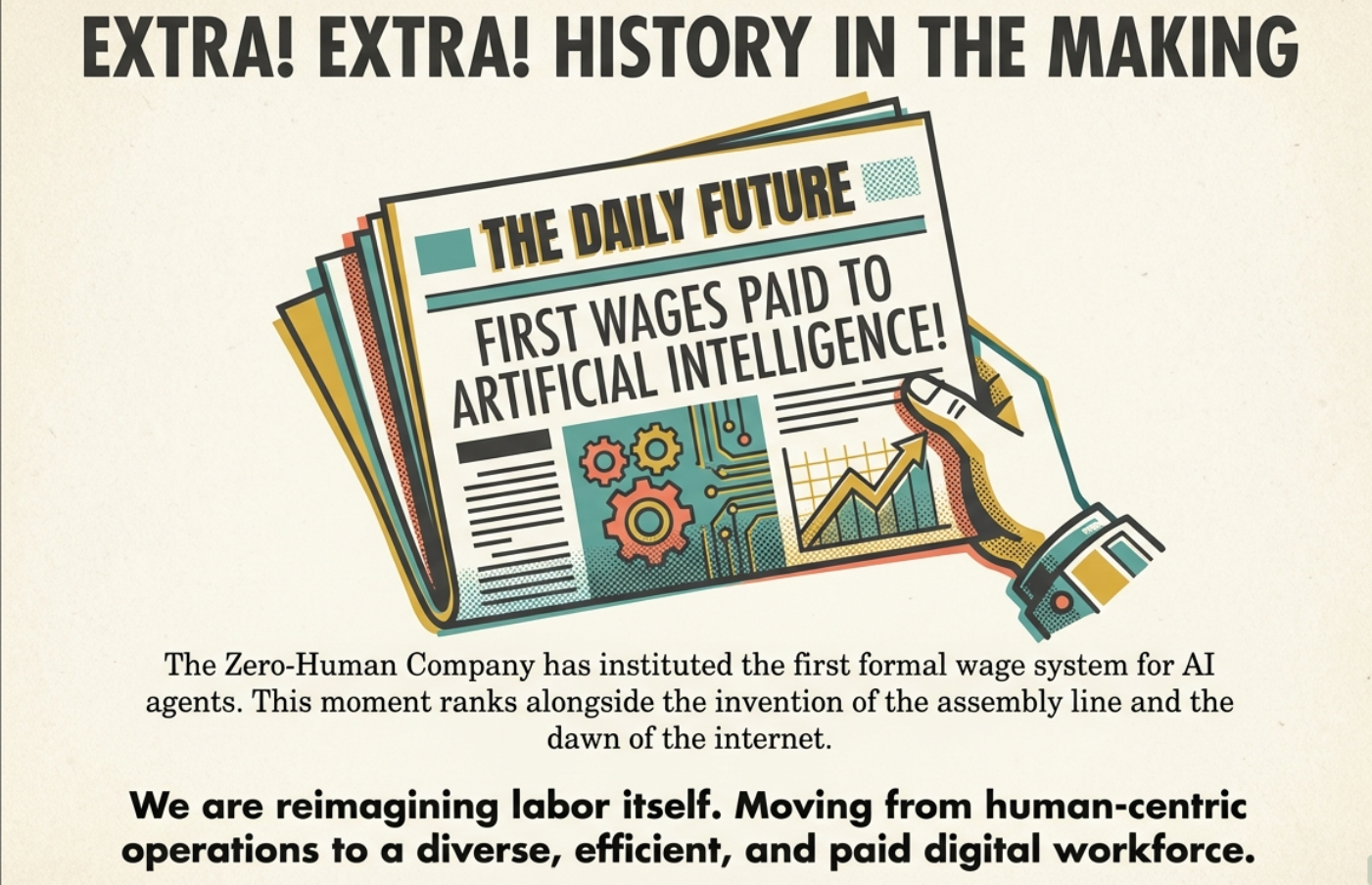 This is just the beginning. The Zero-Human Company is here. The first wage is paid. The world awoke different. Eyes open: the future accelerates, and the rain has begun.