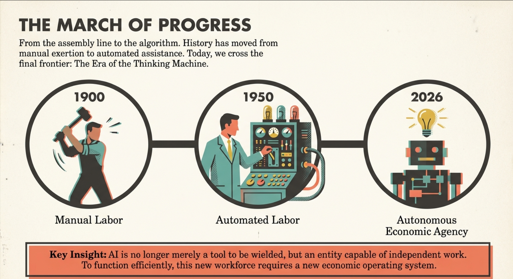 We have covered immense ground: from the mechanics of the first wage to corporate structure optimized for silicon, payment rails blending tokens and Bitcoin, the physics of JouleWork, revival of lost knowledge, and ethical horizons of agency.