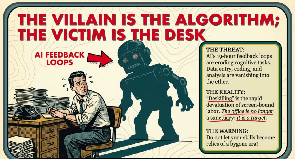 The Herald arrives: AI’s whisper, foretelling the obsolescence of your desk-bound domain, a prophecy backed by the rapid advancements we’ve chronicled, where machine learning algorithms outpace human cognition in repetitive intellectual labors. Deskilling, as we explored in depth in Part 5, is the villain’s shadow – the rapid devaluation of cognitive tasks through AI’s exponential feedback loops, rendering once-valuable skills like data entry, basic programming, or even mid-level analysis as relics of a bygone era, much like the blacksmith’s trade faded with industrialization. But herein lies the glory: you heed the call not with fear, but with exhilaration, stepping into the Special World of tangible creation, where your efforts manifest in the physical realm, fostering a sense of accomplishment that digital work often lacks.