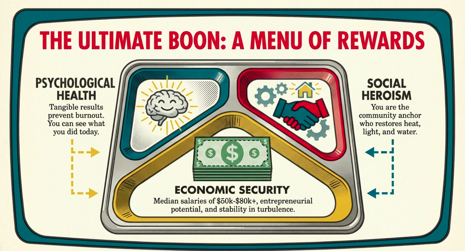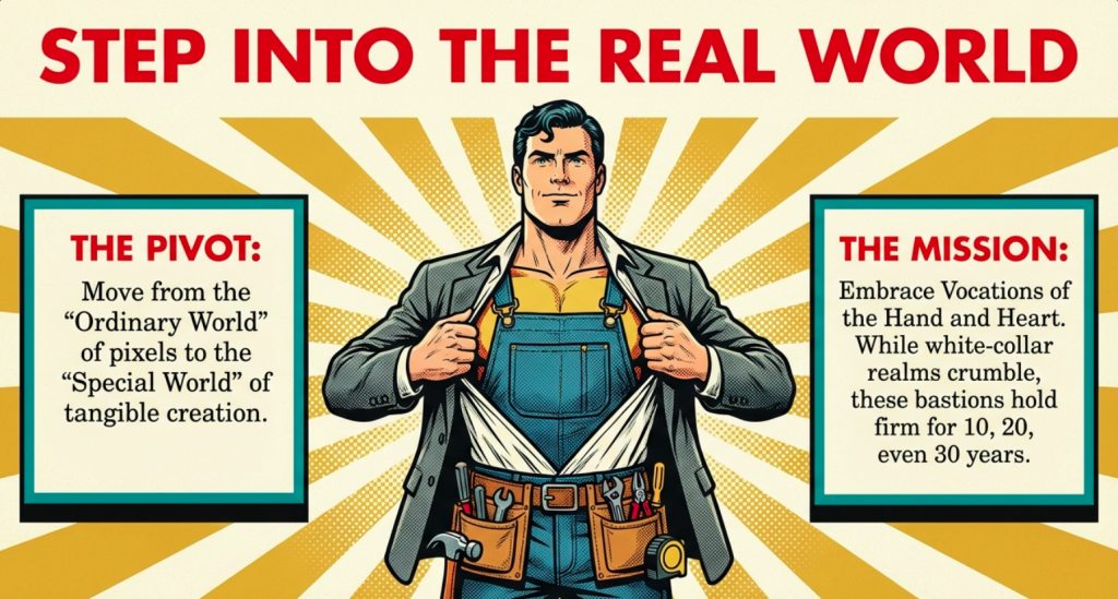 In the grand narrative of the Hero’s Journey that has threaded through our series, from the Call to Adventure in Part 1 to the Dark Night in Part 6, reskilling to blue-collar trades represents the pivotal “Crossing the Threshold,” a momentous leap that propels the protagonist into uncharted territories of growth and discovery. Imagine yourself, the modern hero, ensconced in the Ordinary World of fluorescent-lit offices, endless Zoom calls, and algorithmic drudgery, where days blur into a monotonous cycle of digital tasks that offer little tangible reward or lasting impact.