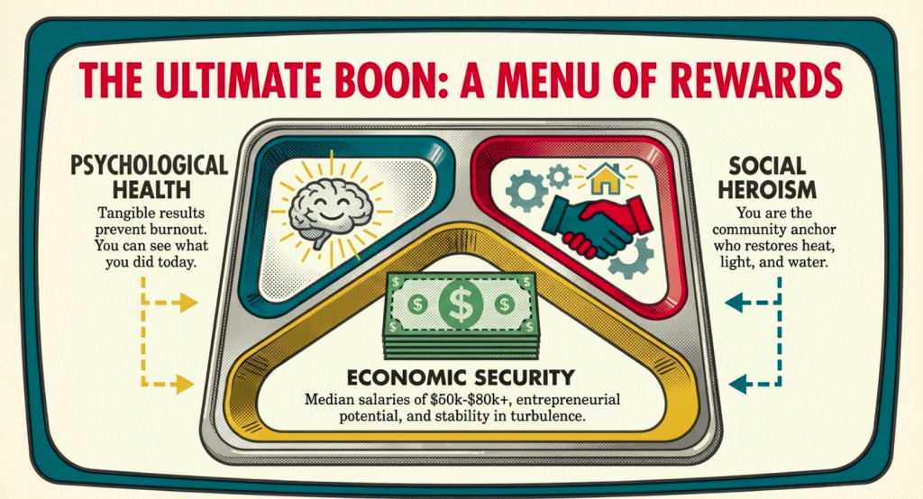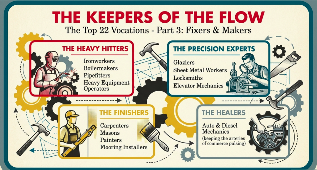 Delve deeper into the essence of these vocations, and the glory unfolds like a tapestry woven from threads of history, psychology, and societal need, revealing layers of value that extend far beyond monetary compensation. These trades reconnect us to primal rhythms – the satisfaction of sweat-earned results, echoing our ancestors’ craftsmanship in an age where disconnection from the physical world breeds widespread discontent, as evidenced by rising rates of burnout in tech-driven professions. In contrast to deskilling’s alienation, where outputs vanish into digital ether without leaving a mark, here every weld, wire, and pipe endures as a testament to your will, much like a farmer’s bountiful harvest or a rancher’s thriving herd stands as living proof of stewardship and resilience. Psychologically, this breeds resilience: studies echo that hands-on work fosters mindfulness, reducing anxiety in our hyper-connected age by grounding individuals in the present moment, promoting flow states where time dissolves amid focused creation, and building self-efficacy through visible achievements that bolster mental health during transitional times like the Interregnum.