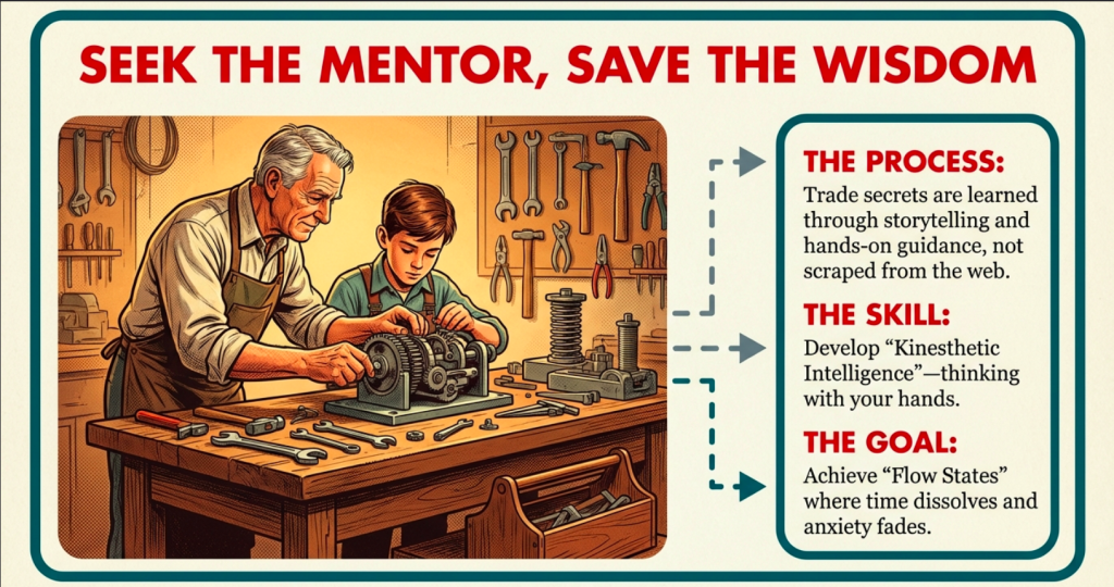 In the Hero’s Journey, this is the “Meeting with the Mentor”: apprenticeships under seasoned artisans, forging not just skills but soul-deep wisdom through hands-on guidance, storytelling of past projects, and the transmission of trade secrets that AI cannot fully capture. You learn to read the language of materials, to dance with tools as extensions of your will, developing a kinesthetic intelligence that enhances cognitive abilities and fosters holistic personal growth. Fulfillment blooms from creation’s immediacy: the satisfaction of a repaired circuit restoring light to a family’s evening, or a welded structure standing defiant against the elements, providing a visceral sense of contribution that counters the existential voids we’ve discussed in earlier parts, like the Dark Night of the Soul.