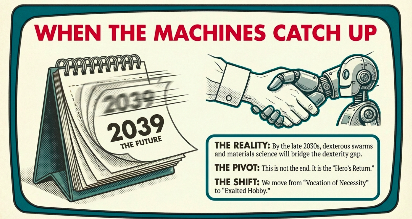 Yet, the saga evolves with inevitability and grace, as we’ve foreseen throughout our series: by the late 2030s or beyond, robots will catch up – dexterous swarms navigating chaos with AI precision, augmented by advancements in materials science, sensor technology, and machine learning that finally overcome current limitations in adaptability and cost. But fear not; this is the Hero’s Return with the Elixir, a triumphant homecoming where the skills honed in necessity become sources of pure delight, transforming potential loss into boundless opportunity for self-expression and communal enrichment. What was vocation becomes exalted hobby, a symphony of joy unbound by necessity, allowing you to pursue these crafts with the freedom of abundance, where time is your greatest asset and creativity knows no bounds.