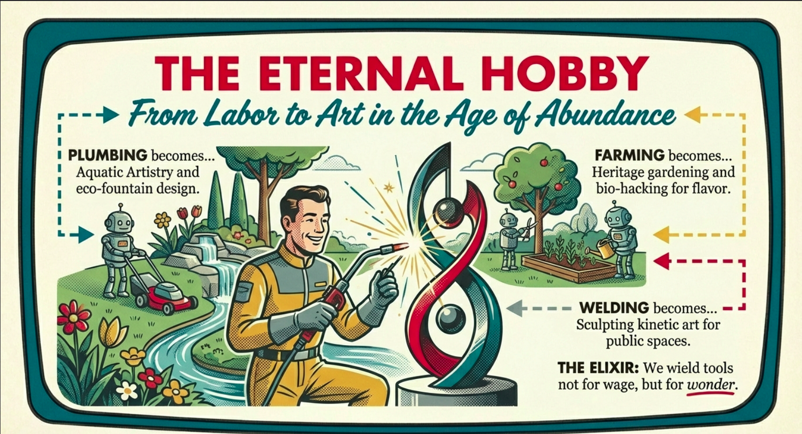This transition is glorious: freed from drudgery, crafts become pure expression, unmarred by deadlines or economic pressures, allowing for experimentation that pushes boundaries – a welder collaborating with artists on installations, or a farmer biohacking crops for novel flavors. Communities flourish with maker spaces, where former tradespeople mentor in leisure, preserving human touch amid machine perfection, fostering intergenerational bonds and cultural continuity as highlighted in our wisdom-saving efforts from Part 8. Psychologically, it’s cathartic – a hobby that once sustained now enriches, combating post-work ennui by providing structure, challenge, and social connection, drawing on the same fulfillment loops that made these vocations rewarding in the first place. Economically, in universal abundance, these pursuits yield cultural capital: artisanal goods as heirlooms, trades as performance art, perhaps even virtual simulations where you teach AI your nuances, ensuring human essence infuses the machine age.