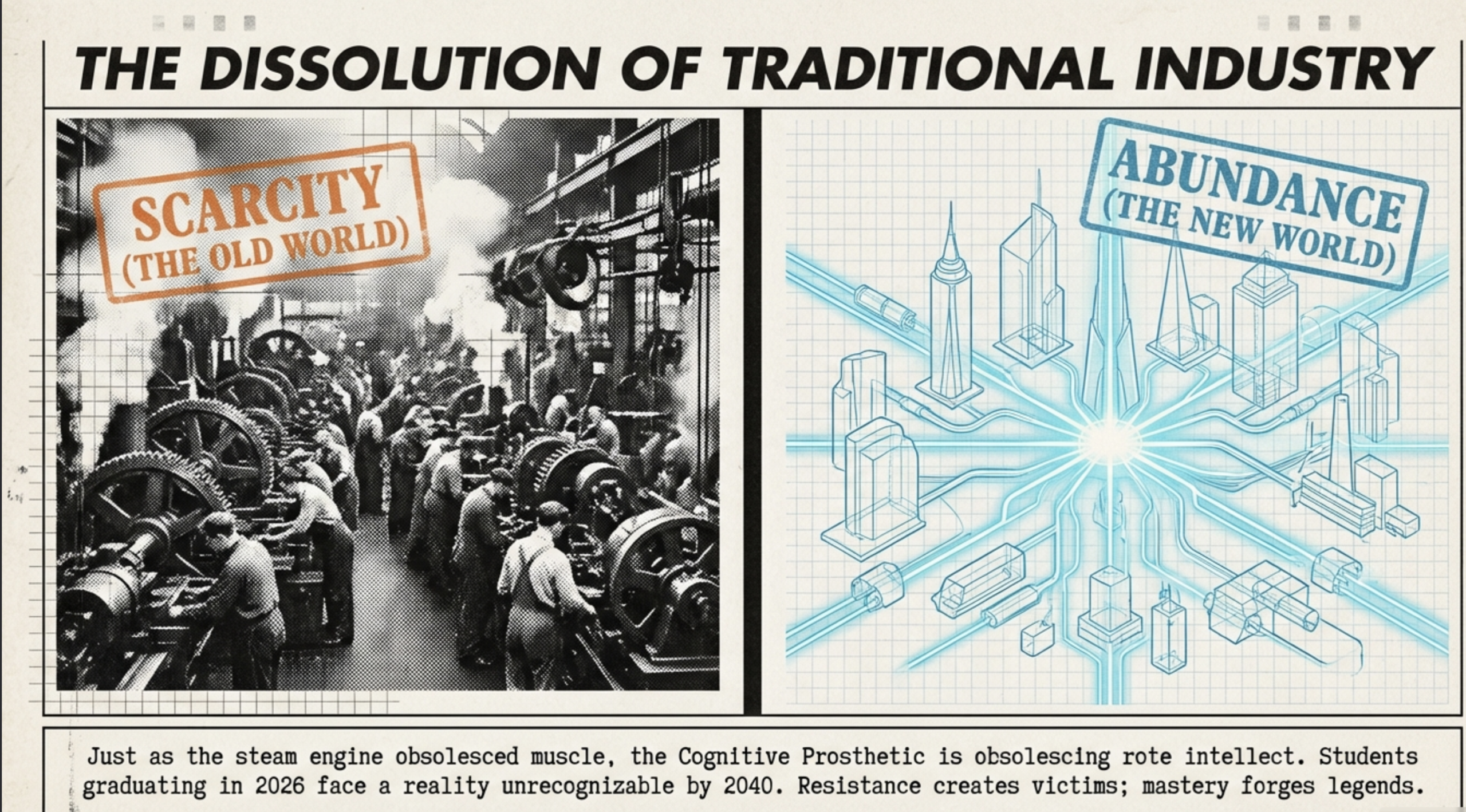 - Part 1 (December 24, 2025): The awakening to the 5000-day horizon where AI and robotics dissolve traditional careers into an Age of Abundance. Students graduating in 2026 face a world unrecognizable by 2040. Read here