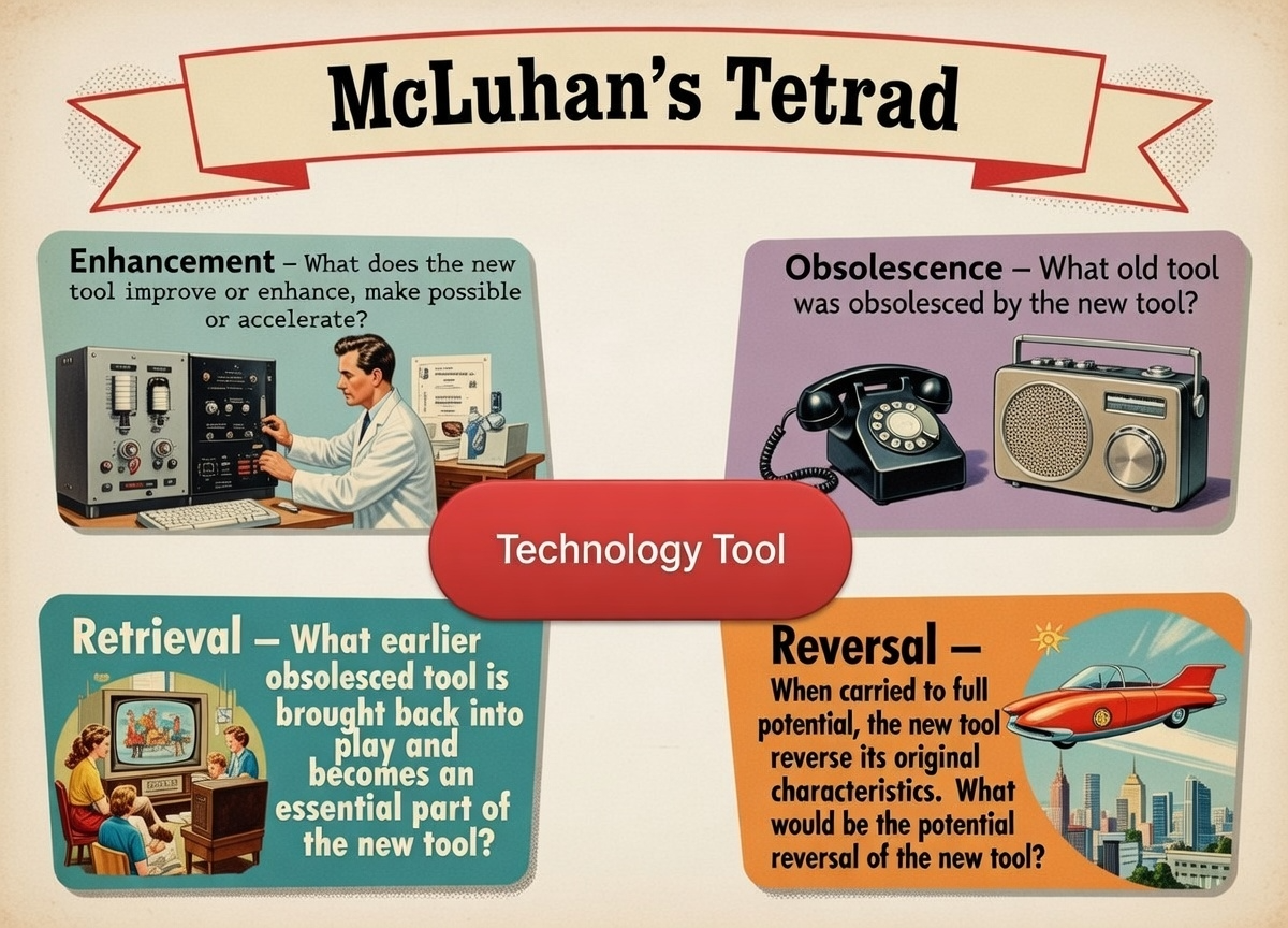 The tetrad of media effects, developed with son Eric and detailed in Laws of Media (1988) (https://amzn.to/4rlDX7x), is McLuhan’s most systematic tool. It poses four simultaneous questions about any medium: What does it enhance? What does it obsolesce? What does it retrieve? What does it reverse into when pushed to extremes? This figure/ground analysis reveals hidden dynamics. It is testable and falsifiable, inspired by Karl Popper. Examples: For the automobile, it enhances mobility (enhance), obsolesces horse-drawn carriages (obsolesce), retrieves the knight in armor (retrieve), and reverses into gridlock (reverse). Nuances: Answers are plural and contextual. The tetrad applies to all human artifacts, not just media. Implications: It anticipates societal flips. This aids policy-making. Abstract concepts like “democracy” can be tetrad-analyzed. This expands its scope beyond tech.