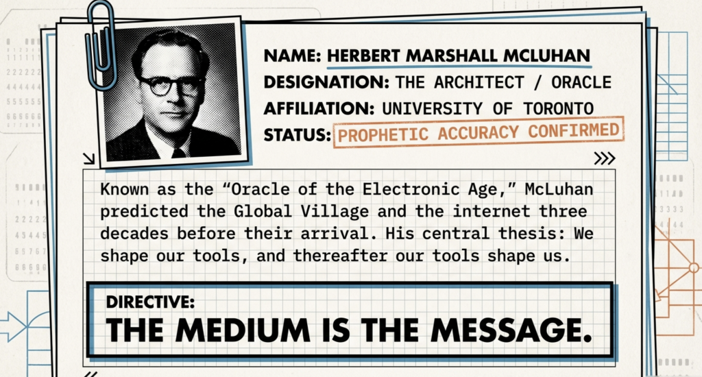 Marshall McLuhan, often called the “oracle of the electronic age,” foresaw how technologies reshape not just societies but the very fabric of human perception and existence. His prescience makes him indispensable for understanding cognitive prosthetics like generative AI. These tools propel us toward a future where work as we know it dissolves.