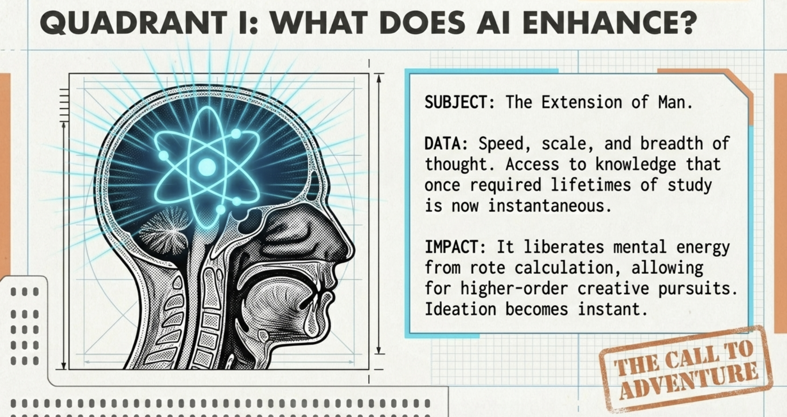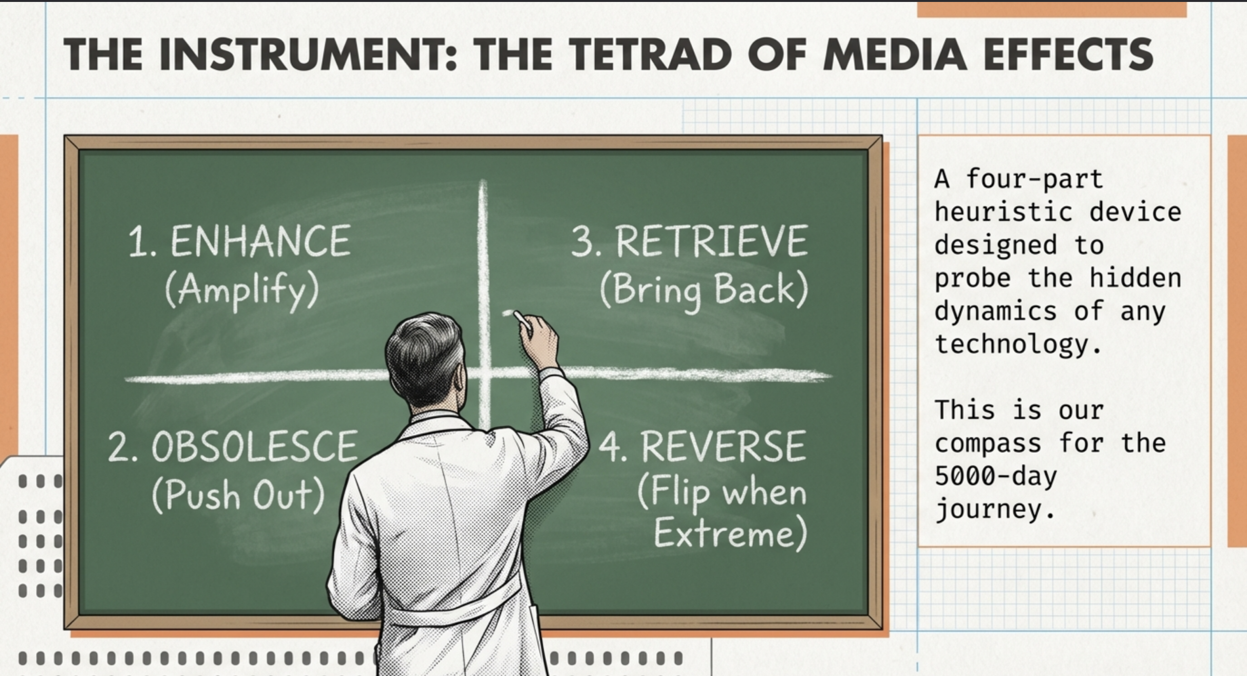 The tetrad, McLuhan’s four laws: enhance, obsolesce, retrieve, reverse, predicts AI’s lifecycle. Enhancement liberates synthesis; obsolescence erodes solitary deep work, outsourcing reasoning and risking cultural loss (unlike calculators, which merely offloaded calculation). Retrieval revives oral traditions and Socratic dialogue, an ally in the abyss reconnecting to pre-literate intuition.