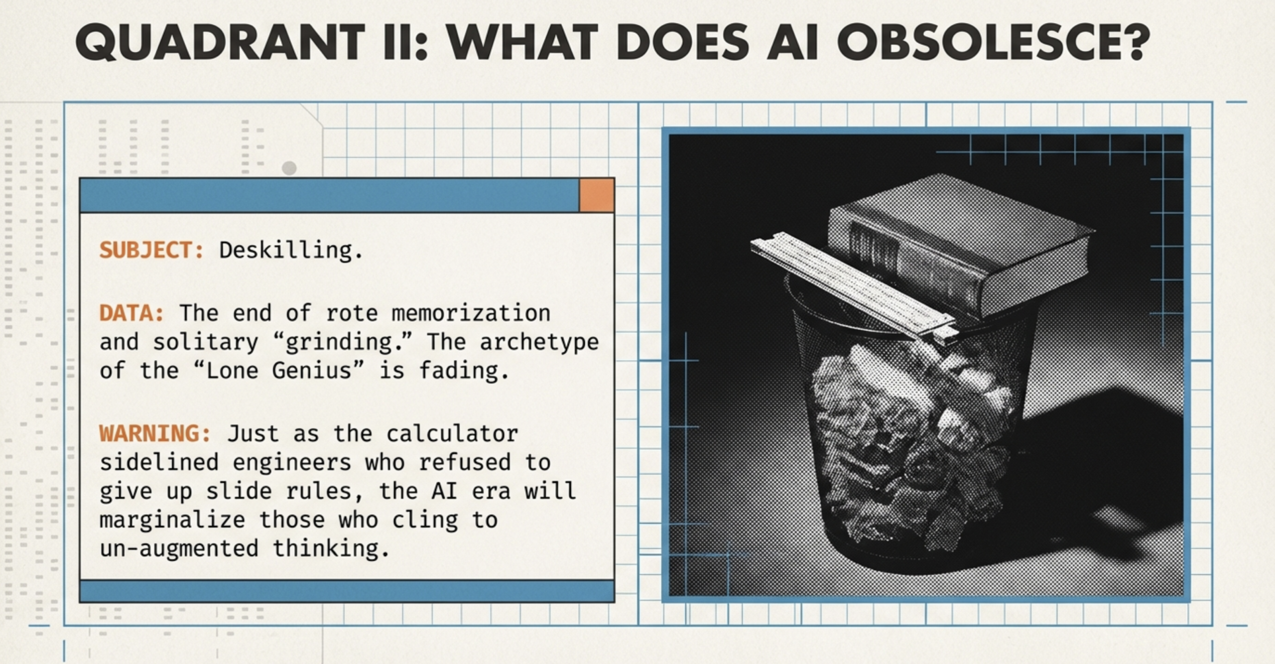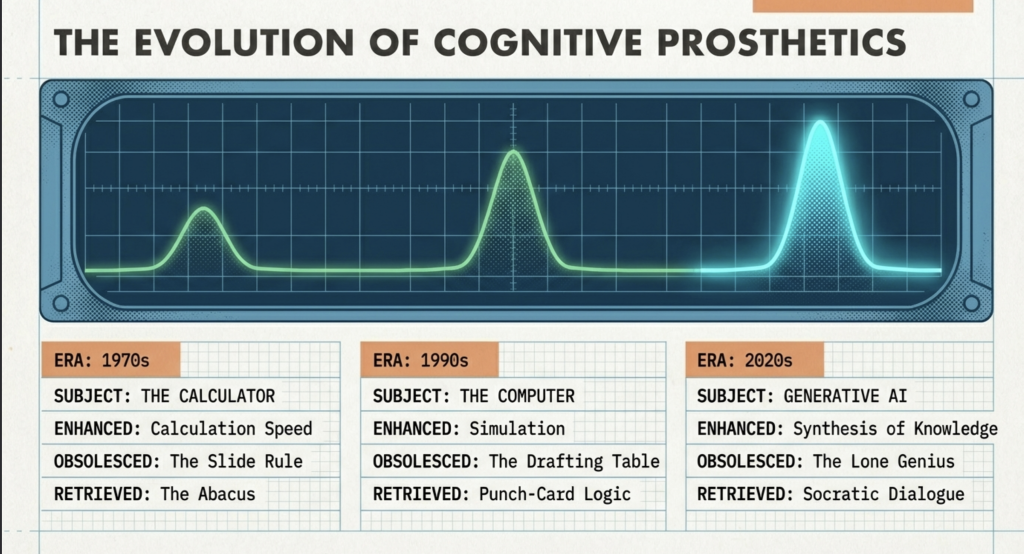| Obsolesces | Slide rules, abacuses, and rote mental calculation. | Manual drafting, physical libraries, and isolated workflows. | Manual calculation, rote memorization, solitary deep work without an always-on collaborator. |