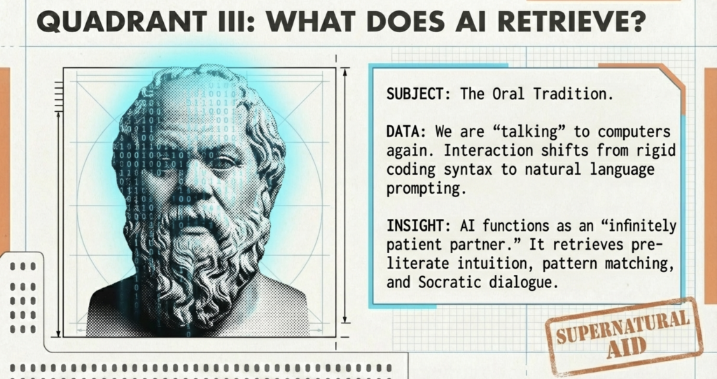 | Retrieves | Mechanical aids like the abacus; collaborative problem-solving in guilds. | Punch-card systems; networked thinking akin to Renaissance polymaths. | Socratic dialogue with an infinitely patient partner; pre-literate intuitive pattern-matching; oral-tradition thinking out loud. |