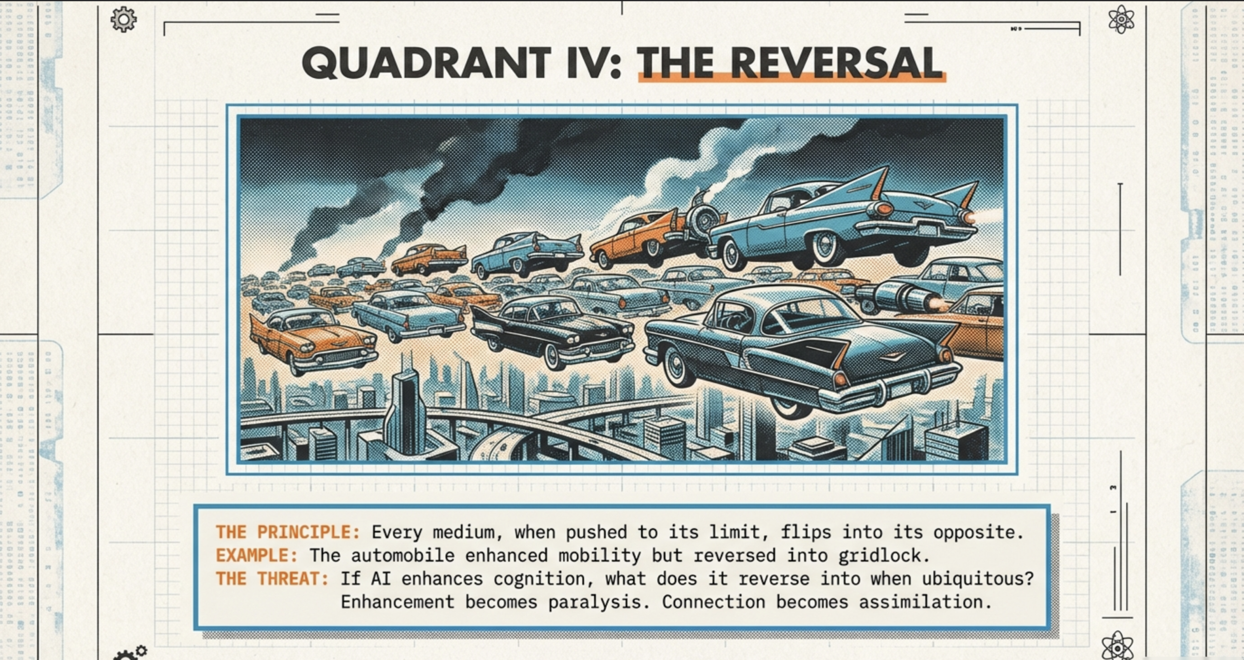 | Reverses Into | Dependency on batteries; loss of basic skills in outages. | Information overload; privacy erosion in networked systems. | Cognitive paralysis, homogenization, dissolution of self (detailed below). |
