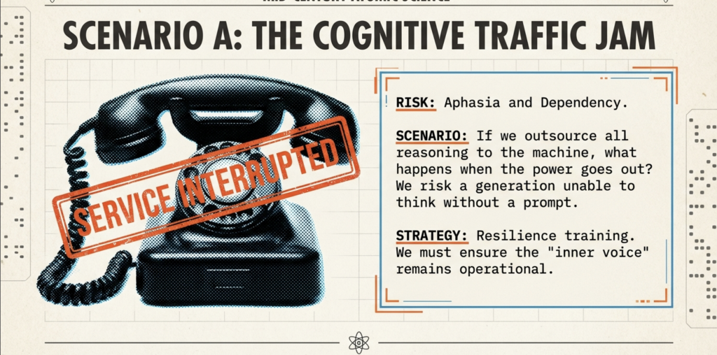 The ordinary world of work ends. The extraordinary realm of liberated purpose dawns. Read on. Act boldly. Become the legend this era forges. We have the cognitive traffic jam/aphasia ahead, dependency paralyzes thought during outages. Nuance: Uneven impact; implication: Mental health crises, but we have resilience training opportunities:
