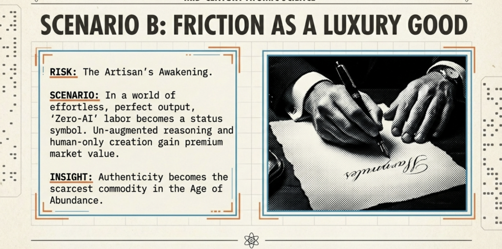 Once AI floods the world with effortless output, “zero-AI” work becomes artisanal prestige, akin to film’s revival post-digital photography. Elite universities tout “no silicon allowed” curricula; consultants premium-price “human-only reasoning”; handwritten plans signal status. The obsoleted slow, error-prone thought flips into scarcity. This ties to Part 9’s Artisan’s Awakening, where embodied craft endures. Explorations: economic shifts favor authenticity markets, but risks elitism. Multiple angles: culturally, it revives tactile experiences; ethically, it questions AI’s role in equity.