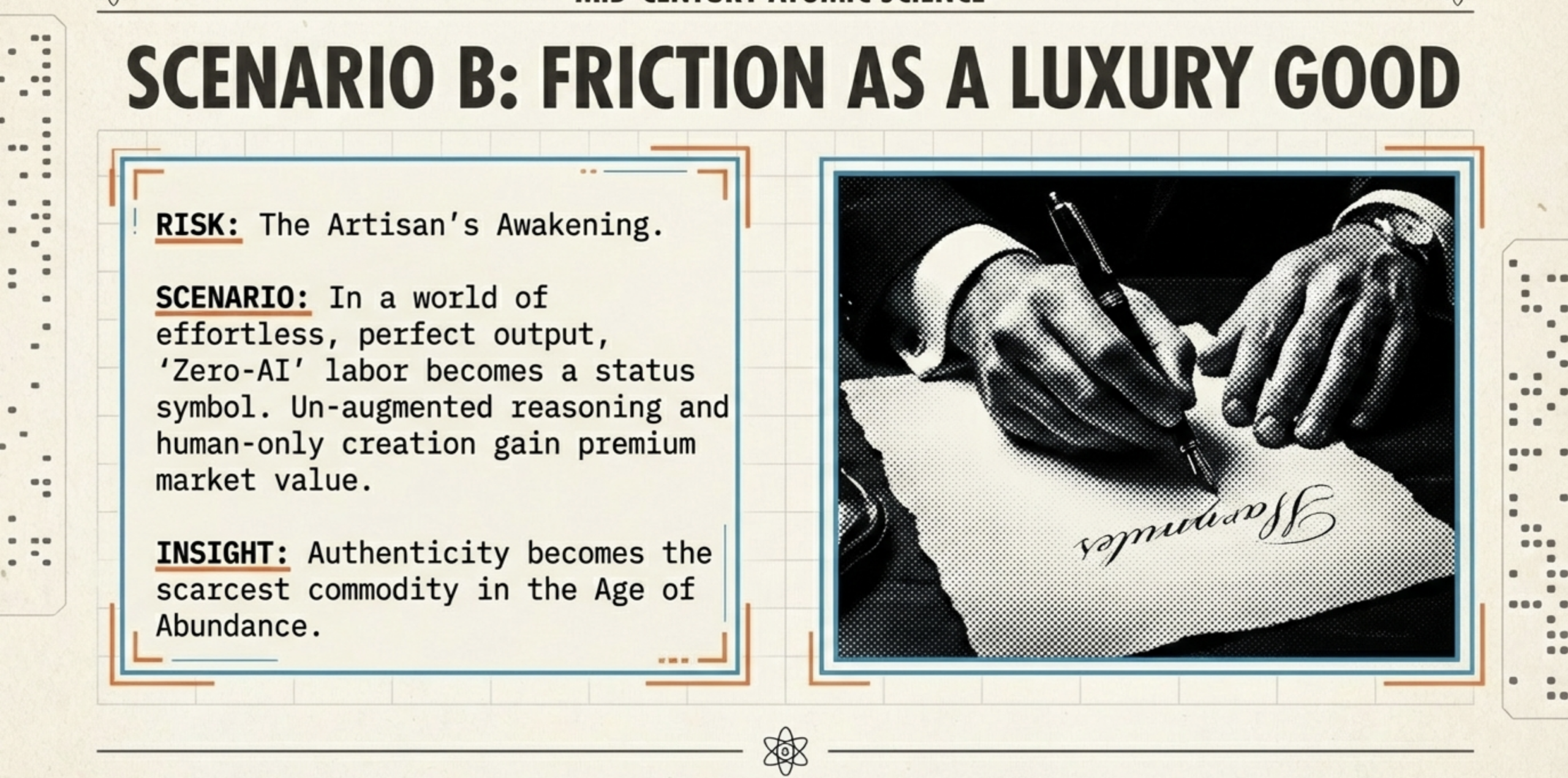 Friction as Luxury: Zero-AI becomes elite (handwritten plans as status). Edge: Elitism risks; related: Ties to artisans.