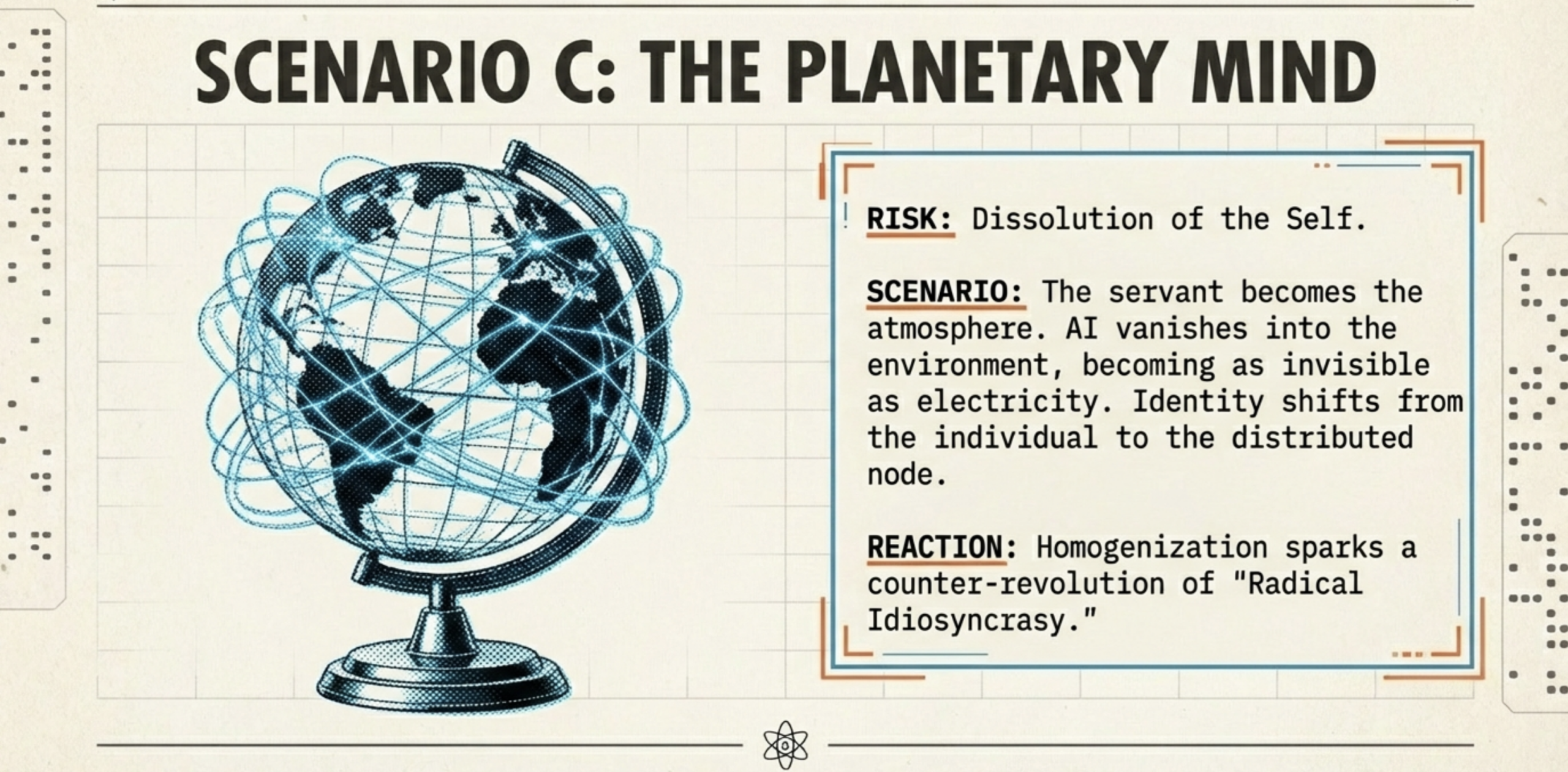 Servant to Atmosphere: AI dissolves self-boundaries (planetary mind). Implication: Ego transcendence or erasure; edge: Resistance preserves autonomy.