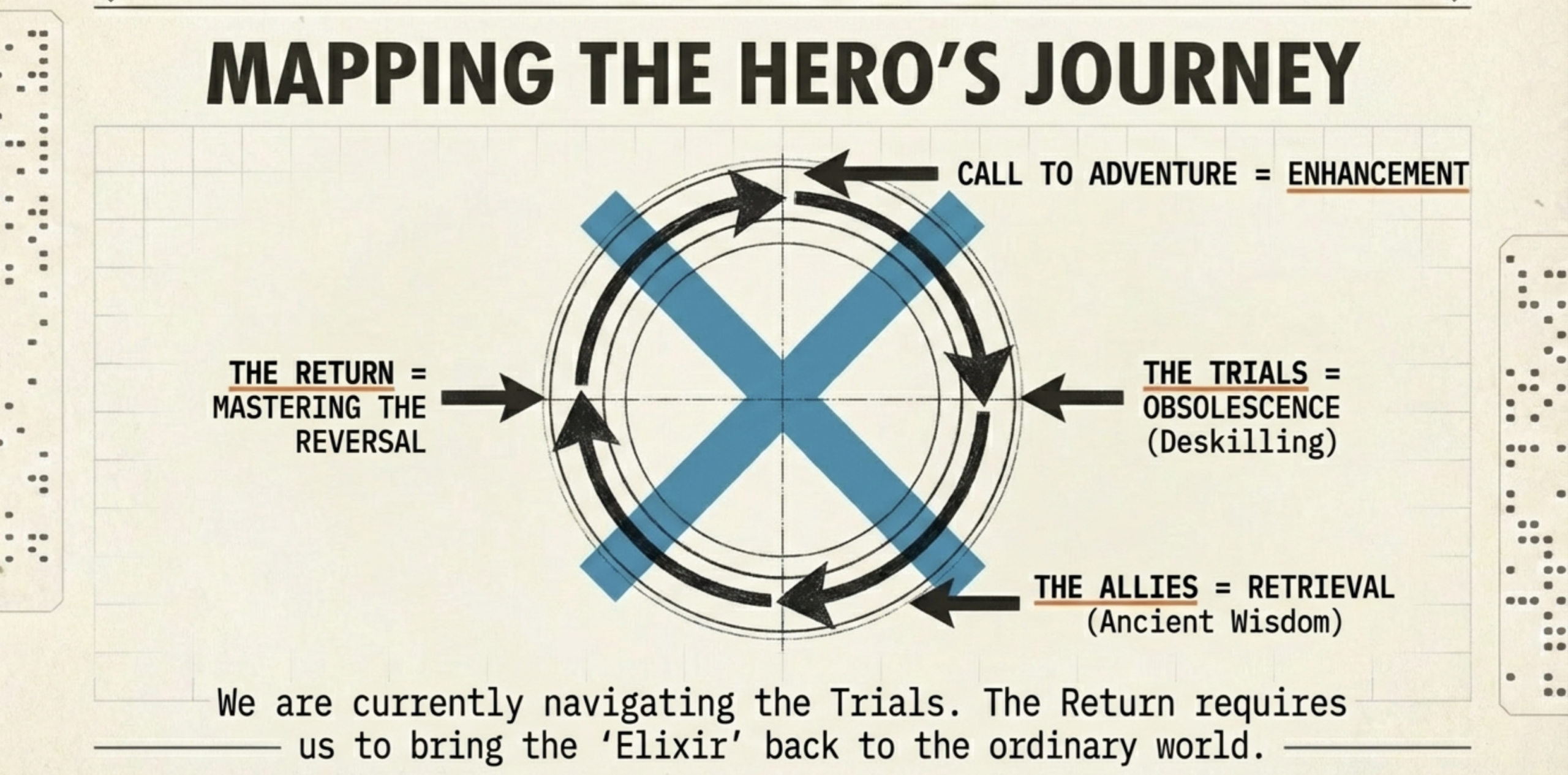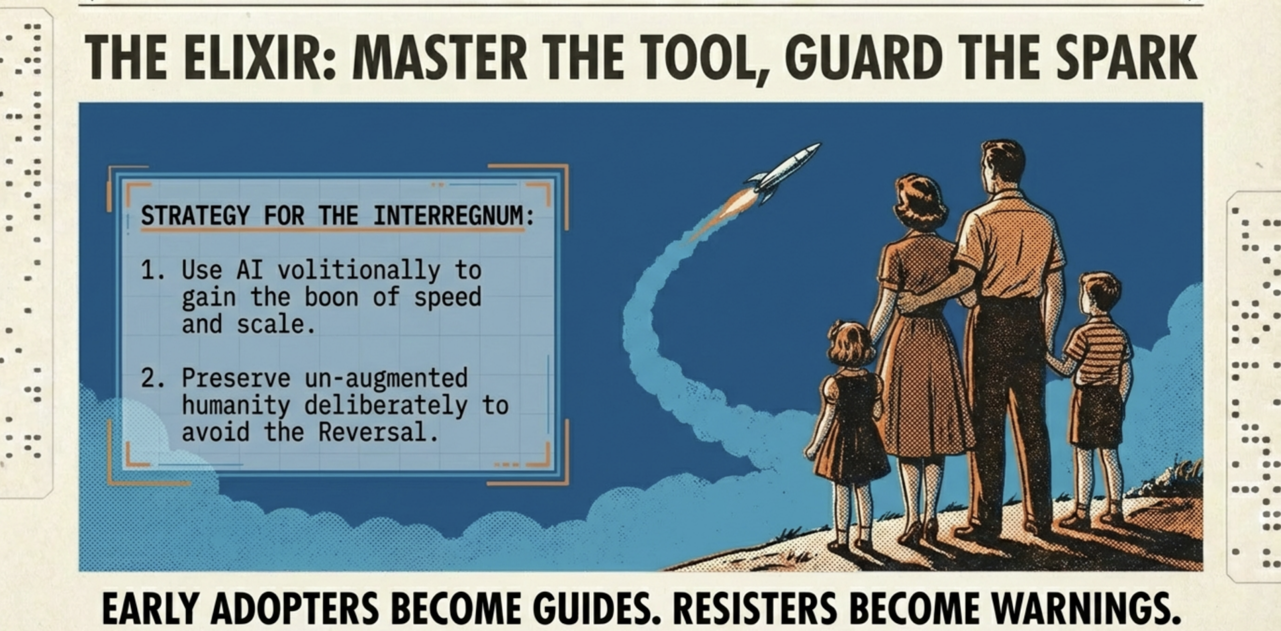 These reversals portend a human species split, yet they culminate the Hero’s Journey’s return. The elixir is volitional mastery: choose active mastery of AI now: integrate it with intent while consciously preserving humanity for later, ensuring the sword serves without wielding you. Maintain human-only reasoning amid abundance, exercising unaugmented muscles daily to prevent atrophy.