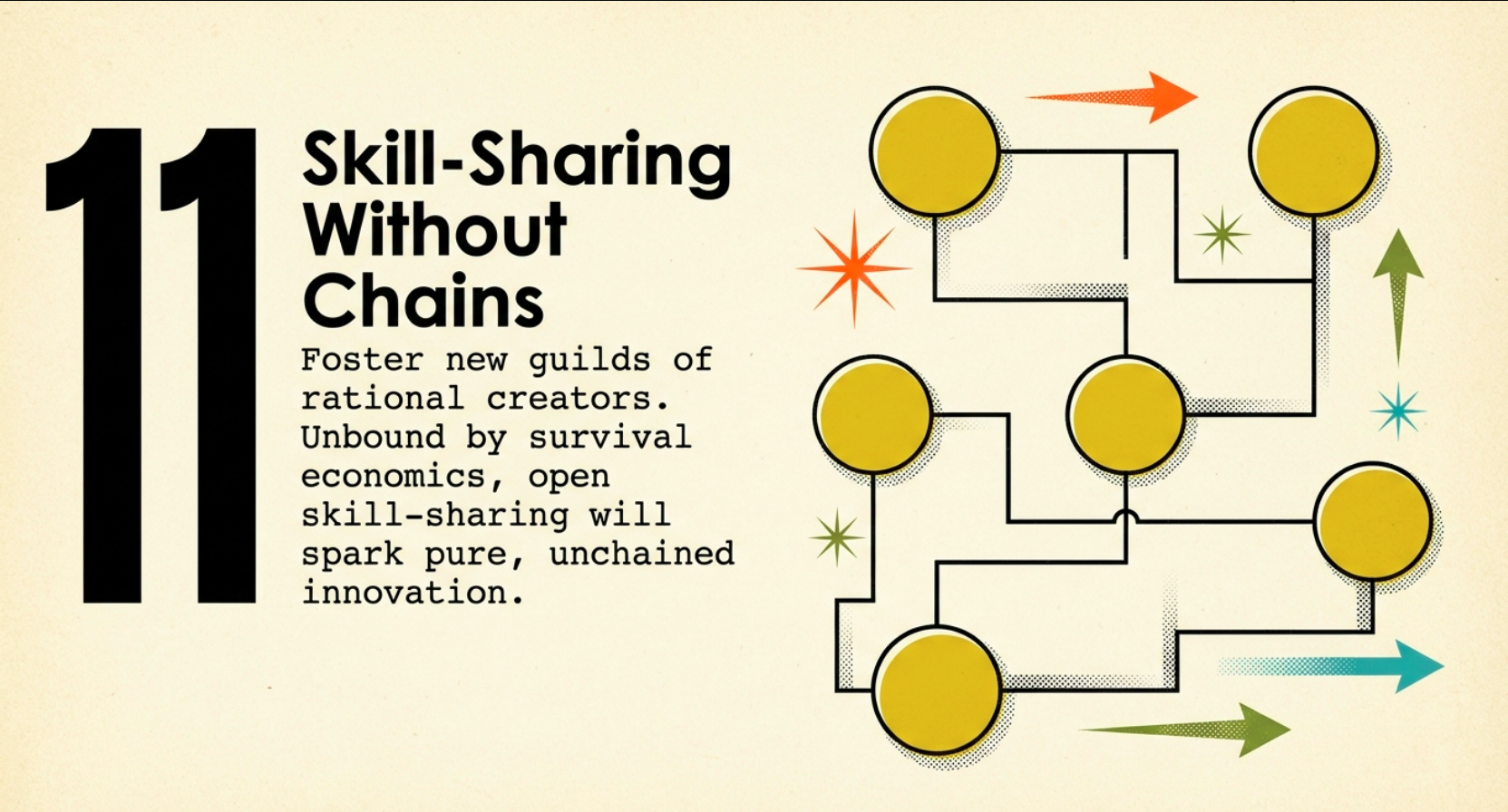 - Solution 1: Create open, merit-driven virtual spaces where value is exchanged rationally, eliminating artificial limits through innovation.