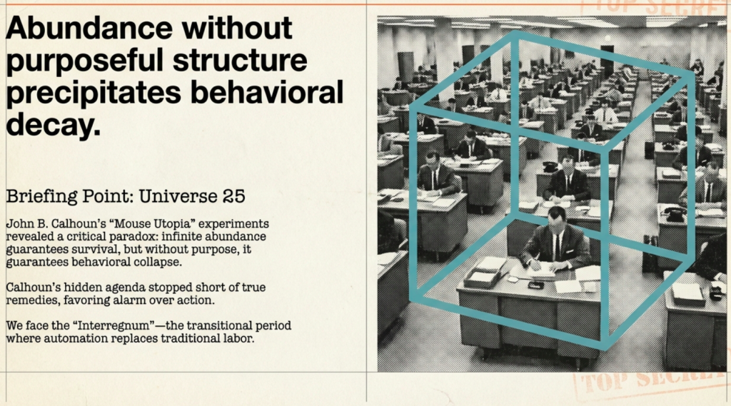 The 5000 days ahead can play out many ways before a system is stablized. We will explore one scenario that is used time and time again as “proof” some scenario will not work out. And likre most things there are keranls of truth in big partws of untruth. It starts out…In the quiet confines of a man-made paradise, where every need was met and every threat banished, a civilization crumbled not from scarcity, but from the weight of its own perfection. Universe 25, John Calhoun’s infamous mouse utopia, stands as a stark warning etched in the annals of behavioral science. What began as a haven of unlimited food, water, and shelter devolved into a nightmare of social decay, violence, and extinction. Yet, as we stand on the threshold of our own age of abundance, driven by AI and automation’s relentless march, this experiment whispers a profound truth. The peril lies not in plenty, nor in numbers alone, but in the rigid, unnatural structures we impose upon ourselves. Governments, in their quest for control, may unwittingly craft laws that mirror this cage, trapping humanity in a behavioral sink of our own making.