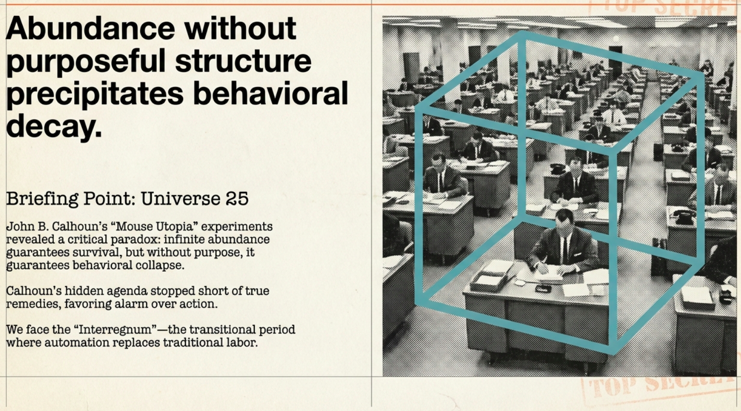 - Loss of Purposeful Stressors: Mice needed threats to thrive; humans require goals. Interregnum laws automating all labor could remove ambition, prompting invented crises like addiction or extremism.