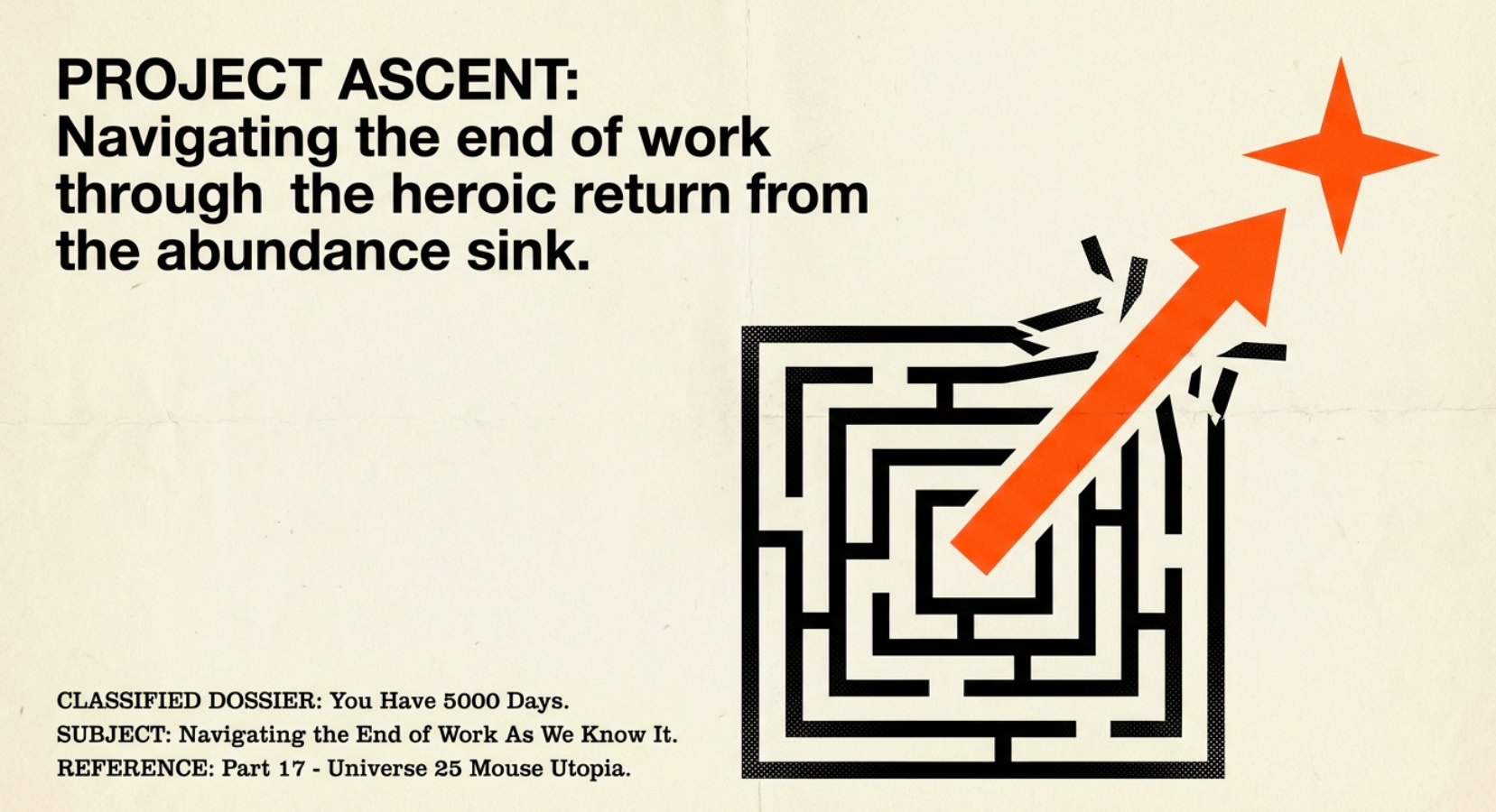 Imagine a world where work vanishes, replaced by boundless leisure and provision. This is the promise of the Interregnum, that turbulent bridge from 2025 to 2039, where AI and robots dismantle old wage systems and usher in unprecedented wealth. But without the call to adventure that true stressors provide, we risk inventing our own demons. In Universe 25, access to social bonds became the fabricated torment, fracturing the colony’s soul. Today, as we navigate this transformation, we must heed the hero’s journey. The ordinary world of toil is ending; the refusal of the call leads to stagnation. Only by embracing trials, seeking mentors in wisdom, and transforming our societal designs can we emerge victorious, forging a golden age from the ashes of potential collapse.