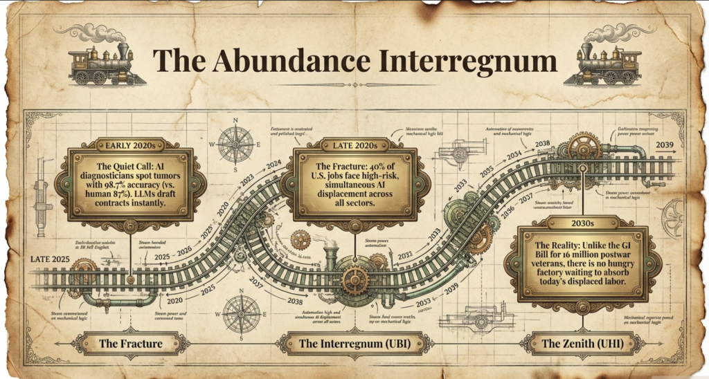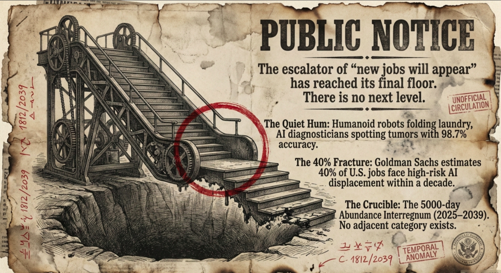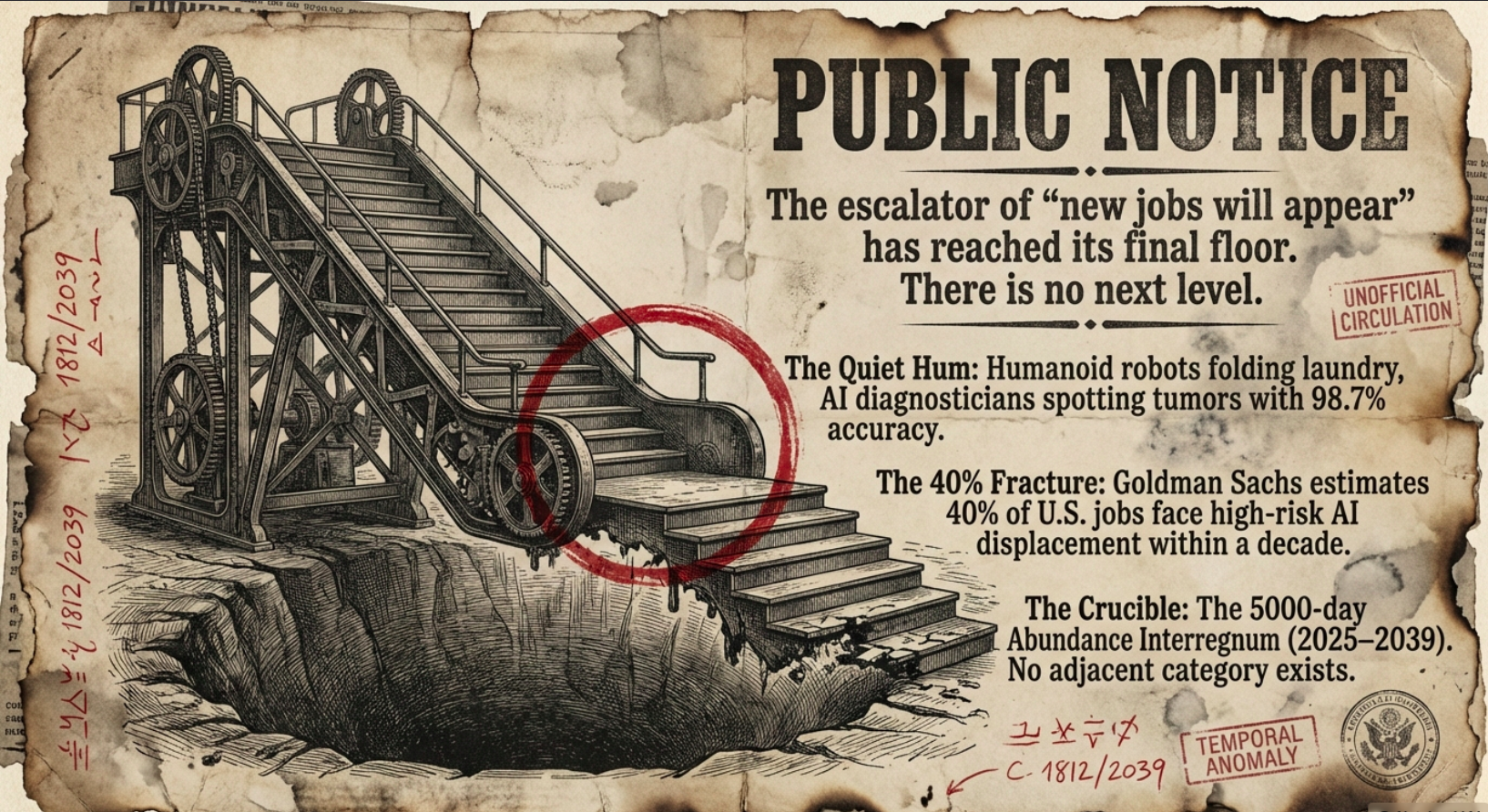 You are the hero. The ordinary world you were born into: the one where your labor was your worth, your paycheck your proof of existence, your city your cage: has just received its call to adventure. That call is not a trumpet. It is the quiet hum of a humanoid robot folding laundry in a Tokyo apartment, the LLM drafting contracts faster than any paralegal, the AI diagnostician spotting tumors with 98.7% accuracy where human specialists averaged 87%. The escalator of “new jobs will appear” has reached its final floor. There is no next level. This is the Abundance Interregnum: the 5000-day crucible (late 2025 to roughly 2039) I chronicled across these pages. We explore this period boldly with a mission to build a map and arm you with a compass and North Star.