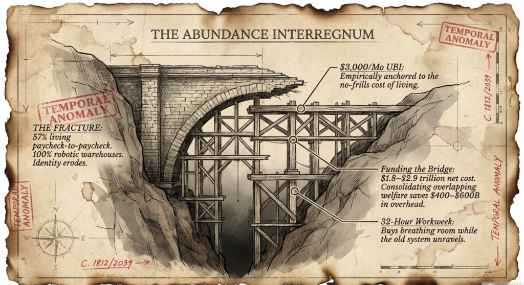 Call it UBI (Universal Basis Income) for now: $3,000 per month per adult, empirically anchored to median America’s no-frills cost of living (MIT Living Wage Calculator + BLS data: $2,800–$3,200 today). For 50–80 million in the broad middle class (not the capital owners who ride the productivity wave first), the annual bill lands at $1.8–$2.9 trillion net after consolidating overlapping welfare bureaucracies that already waste $400–$600 billion in overhead. America spent $5 trillion in 18 months during COVID; we built the Interstate Highway System; we sent a generation to college. Capacity is not the issue. Political will, forged in the fire of visible desperation, will be.