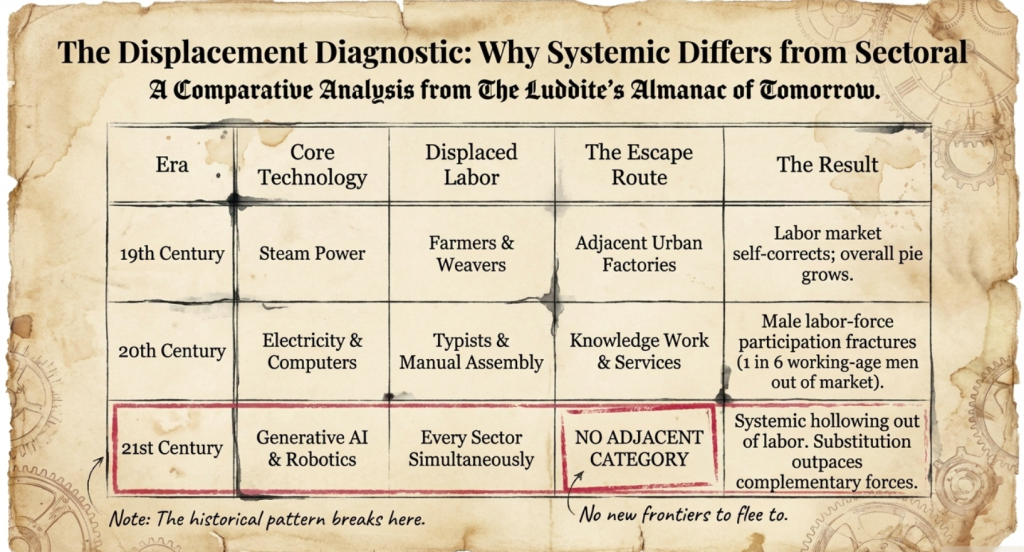 History’s pattern was sectoral. Steam replaced farmers; electricity replaced steam workers; computers replaced typists. Each time, labor markets self-corrected because adjacent categories absorbed the displaced. Goldman Sachs now estimates 40% of U.S. jobs face high-risk AI displacement within a decade: every sector, simultaneously. No adjacent category exists. The GI Bill worked for 16 million veterans because postwar factories hungered for hands. Today’s displacement has no hungry factory waiting. This is not just taking place in the US, but worldwide. This includes low cost labor pools in China and India.
