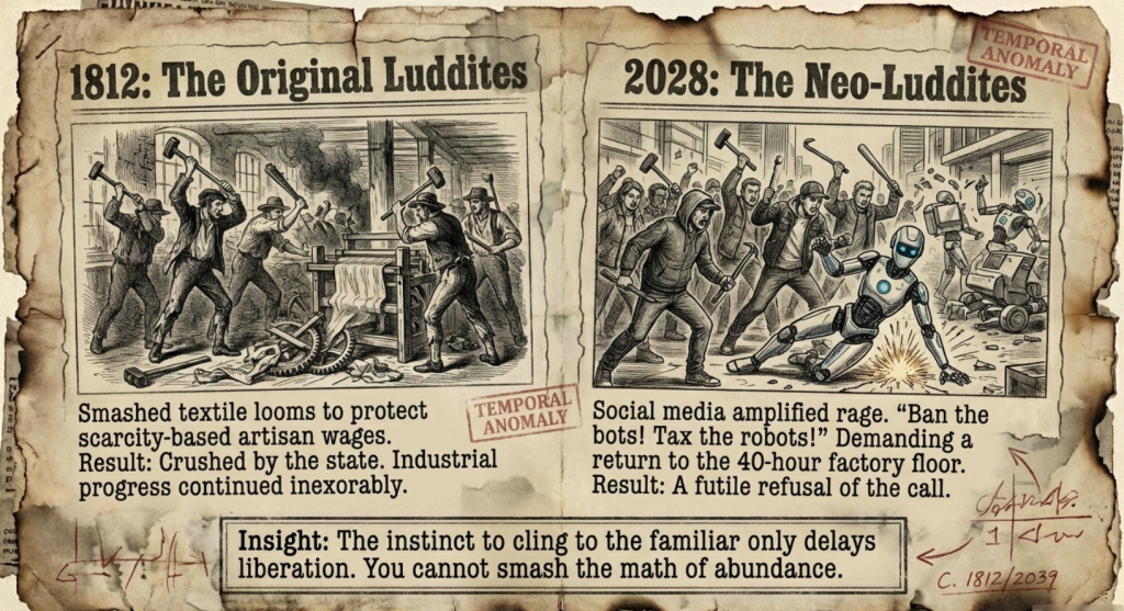 The displaced workers, uninformed and suddenly adrift after lifetimes defined by a paycheck, will find themselves herded into the ranks of the Neo-Luddites: modern echoes of the 19th-century textile smashers who once believed machines stole their souls. Social media will amplify their rage: “Ban the bots!” “Tax the robots!” “Bring back the 40-hour factory floor!” Politicians, sensing the electoral powder keg, will fan the flames rather than extinguish them, promising ever-more generous checks while demonizing the very technologies that could liberate everyone.