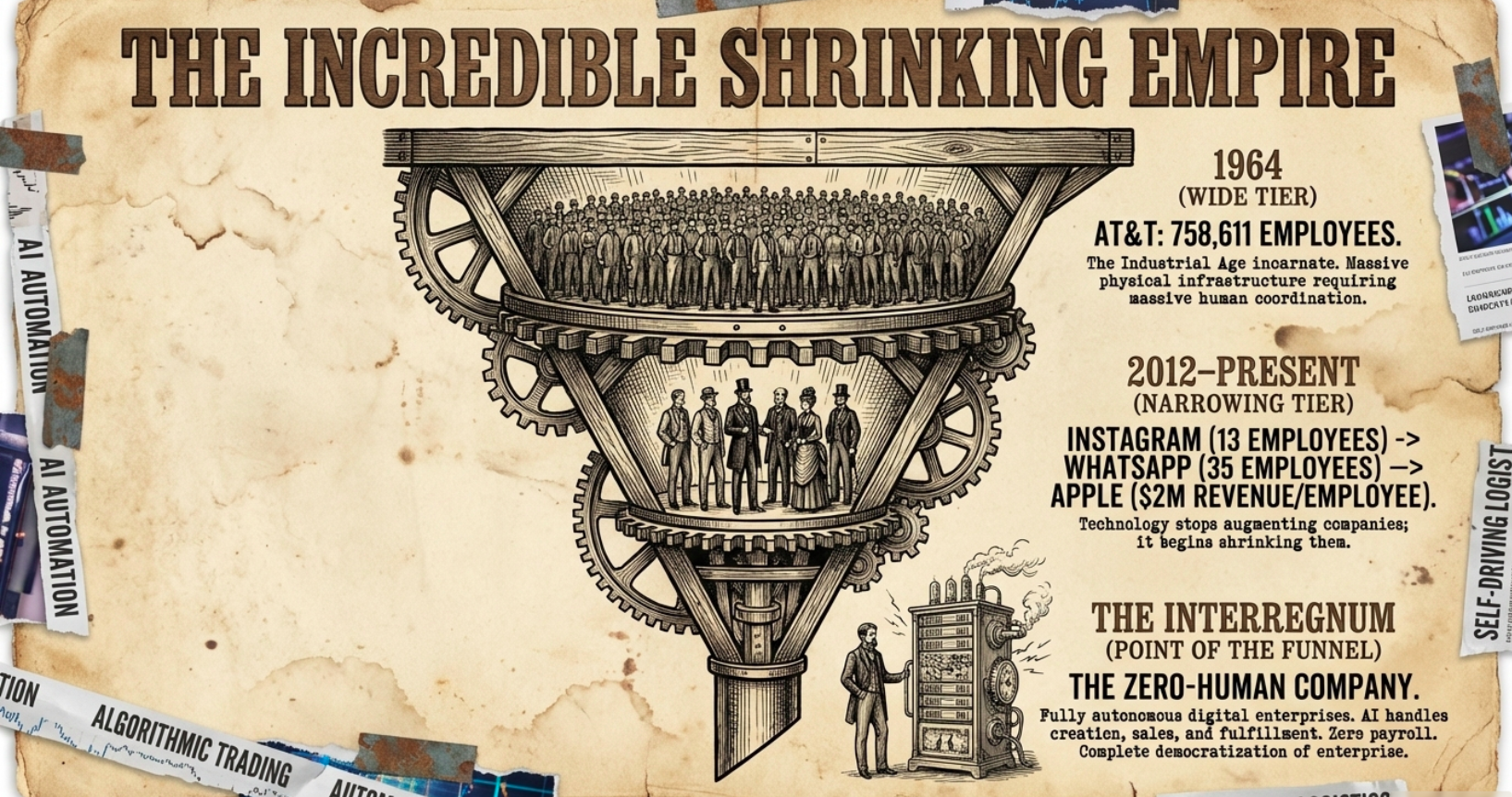 As AI and robotics accelerate, this shrinkage continues its logical march: from a few people to one person to zero human employees. Entire enterprises now run as autonomous digital or physical entities, producing revenue streams without any payroll at all. The old corporate behemoths that once anchored cities and defined economic power are dissolving into something far more nimble, far more personal, and far more democratized. This is the visible handwriting on the wall that the political dinosaurs refuse to read.