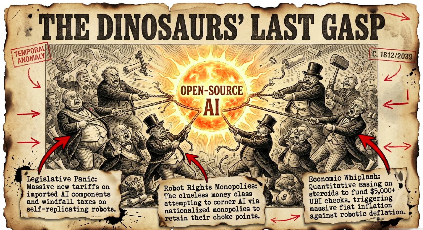 Neo-Luddite (Antifa-like masked hoards) marches will clog city streets, smashing working robots in viral videos while ignoring the open-source blueprints that let any teenager print a better one at home. The political dinosaurs will seize these moments for grandstanding hearings and “AI safety” commissions stacked with the same experts who missed the 2025 tipping point entirely.
