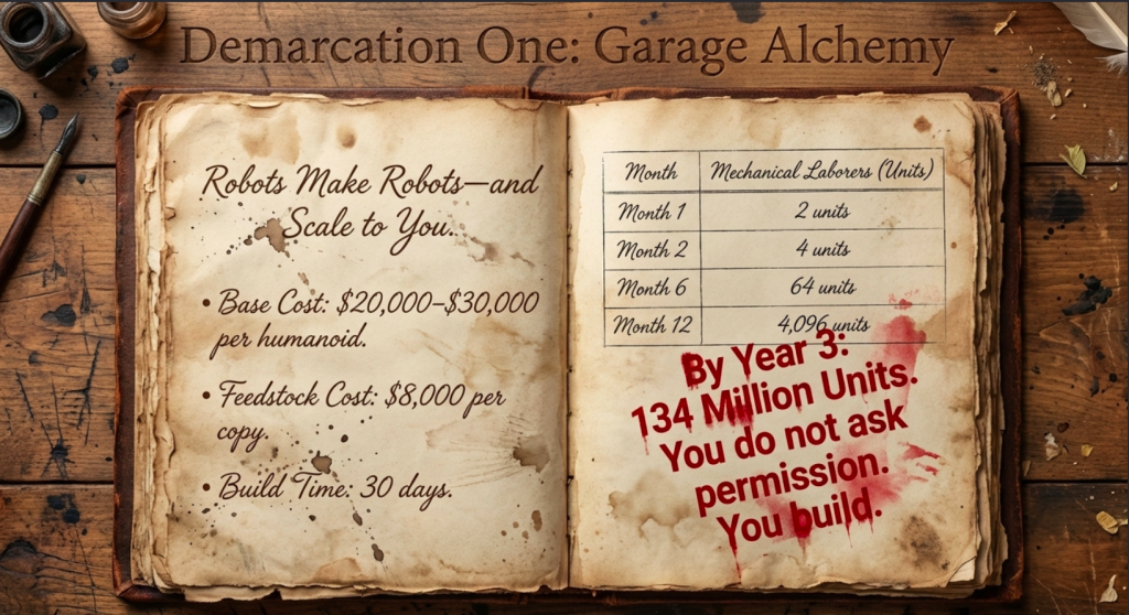 Assume conservative parameters: one robot assembles a copy in 30 days using $8,000 in feedstock and energy it generates itself. Starting with one personal unit you own or rent-to-own, Month 1: 2 robots. Month 2: 4. By Month 12: 4,096. By Year 3: over 134 million units if the community coordinates open-source replication. This is not factory monopoly; it is garage alchemy. Every household, every guild, every rural plot gains the labor capacity of the entire 2025 expert class with one AI upgrade. The means of production decentralize so completely that ownership of capital itself democratizes. You do not ask permission. You build.