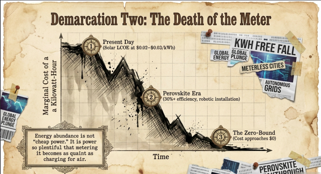 Solar levelized cost of energy (LCOE) has already fallen to $0.02–$0.03 per kWh in optimal regions and continues its Moore’s-Law-like plunge. With robotic panel installation, perovskite efficiencies pushing 30%+, and battery costs halving every 18 months, the marginal cost of a kilowatt-hour on your own roof approaches zero. Fusion pilots and advanced geothermal close the last gaps. Energy abundance is not “cheap power.” It is power so plentiful that metering it becomes as quaint as charging for air.