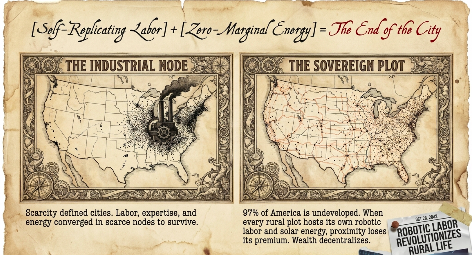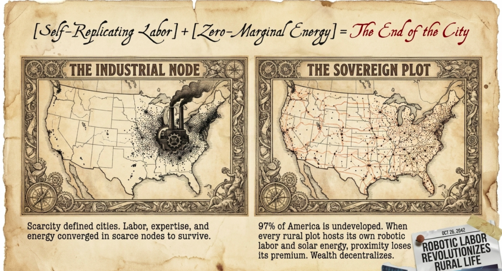 These two demarcations empty the Industrial Age centrisms. Cities formed because labor, expertise, and energy converged in scarce nodes. When every plot of land: currently 97% of America’s 3.5 million square miles is rural or undeveloped: can host self-replicating robots powered by personal solar arrays, proximity loses its premium. Telepresence via Starlink-level broadband, robotic construction, autonomous transport at $0.20–$0.40 per mile (marginal cost: electricity + maintenance), and AI healthcare/education at near-zero marginal cost dissolve the economic gravity of downtowns. People spread far and wide, then ultimately to space: because the same replication logic scales to orbital factories and lunar forges. The frontier reopens.