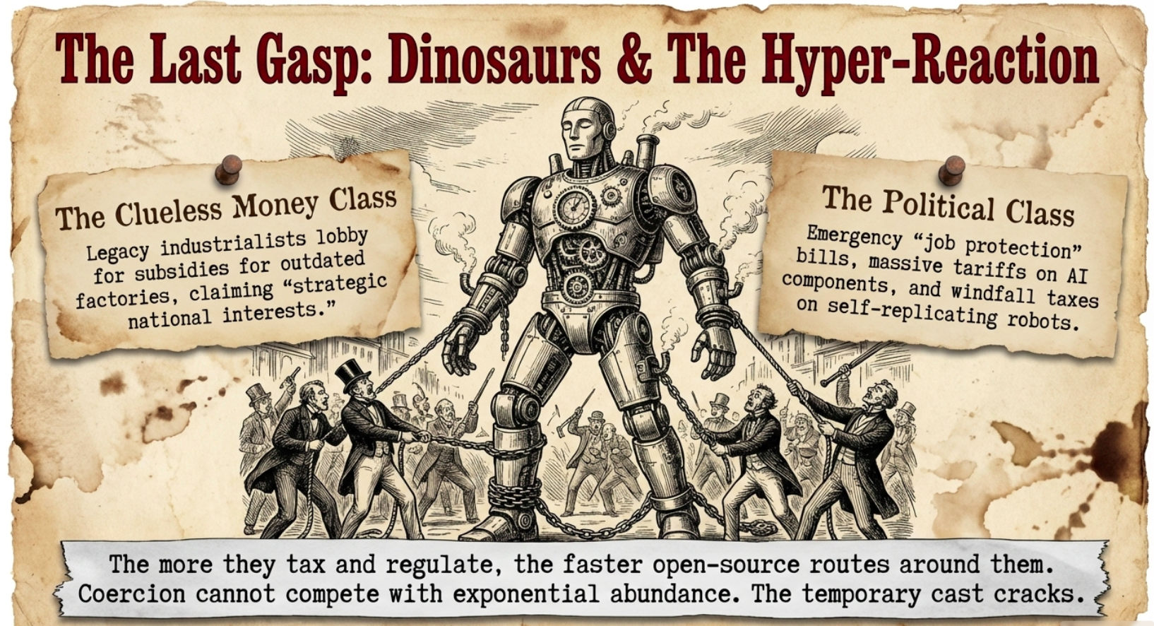 As the Abundance Interregnum accelerates and the first waves of displacement crash against the shores of the old economy, the dinosaurs of that era: the career politicians, legacy union leaders, and the clueless money class who spent decades assuming the scarcity-based Industrial Age would last forever: will clutch at their failed ideas with increasing desperation. They watched the productivity curves bend upward but refused to read the writing on the wall, convinced that their regulatory frameworks, central-bank levers, and vote-buying welfare expansions could simply be scaled larger to hold the crumbling edifice together.
