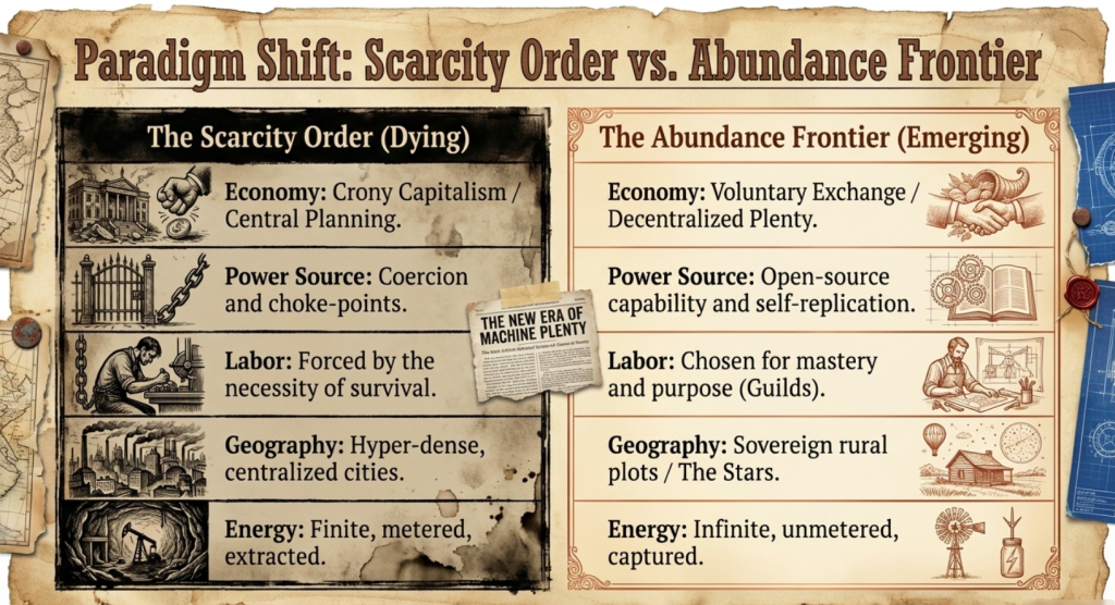 It is not utopia. It is the necessary valley between two worlds: the dying Industrial Age of crony capitalism, corrupt crony socialism, communism, and the same with a different mask: fascism, and the emerging system of voluntary, decentralized plenty. The old order required scarcity to justify its hierarchies. The new one renders scarcity obsolete. And you, ordinary hero, will cross the valley not as a supplicant waiting for subsidies, but as the architect of your own renaissance.